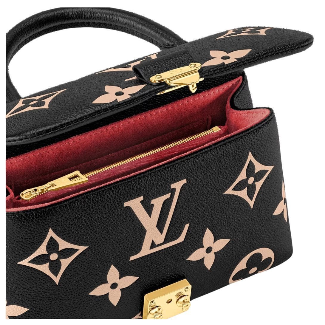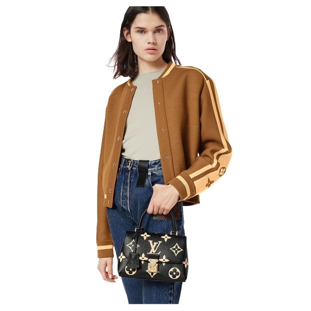 The bag is secured with the same S-lock found on the iconic Pochette Metis, providing both style and functionality. A single articulated top handle brings a ladylike feel to the design, while a removable strap offers additional carry options, allowing you to wear it over the shoulder or crossbody.