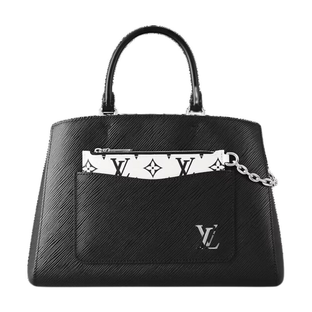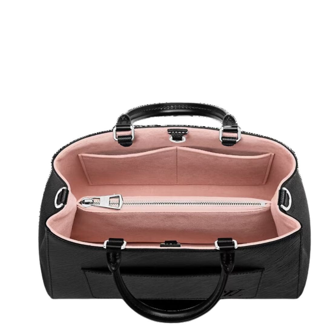 Measuring 11.8 x 8.3 x 5.1 inches, the Marelle Tote MM epitomizes understated elegance in classic black, complemented by smooth Epi leather and supple grained-cowhide trim that adds a touch of refinement to the design. The pale pink microfiber lining enhances its luxurious appeal, while the silver-color hardware adds a hint of sophistication.
