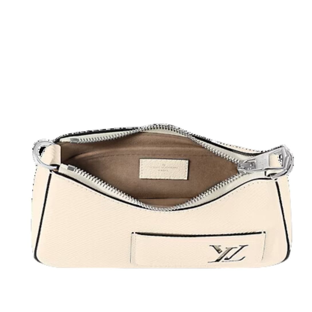 Measuring 7.5 x 5.3 x 2.6 inches, the LOUIS VUITTON MERELLINI handbag is perfectly proportioned for everyday wear, offering both style and functionality. The elegant Quartz White hue adds a touch of refinement, while the Epi-grained cowhide leather and smooth cowhide leather trim ensure durability and luxury.