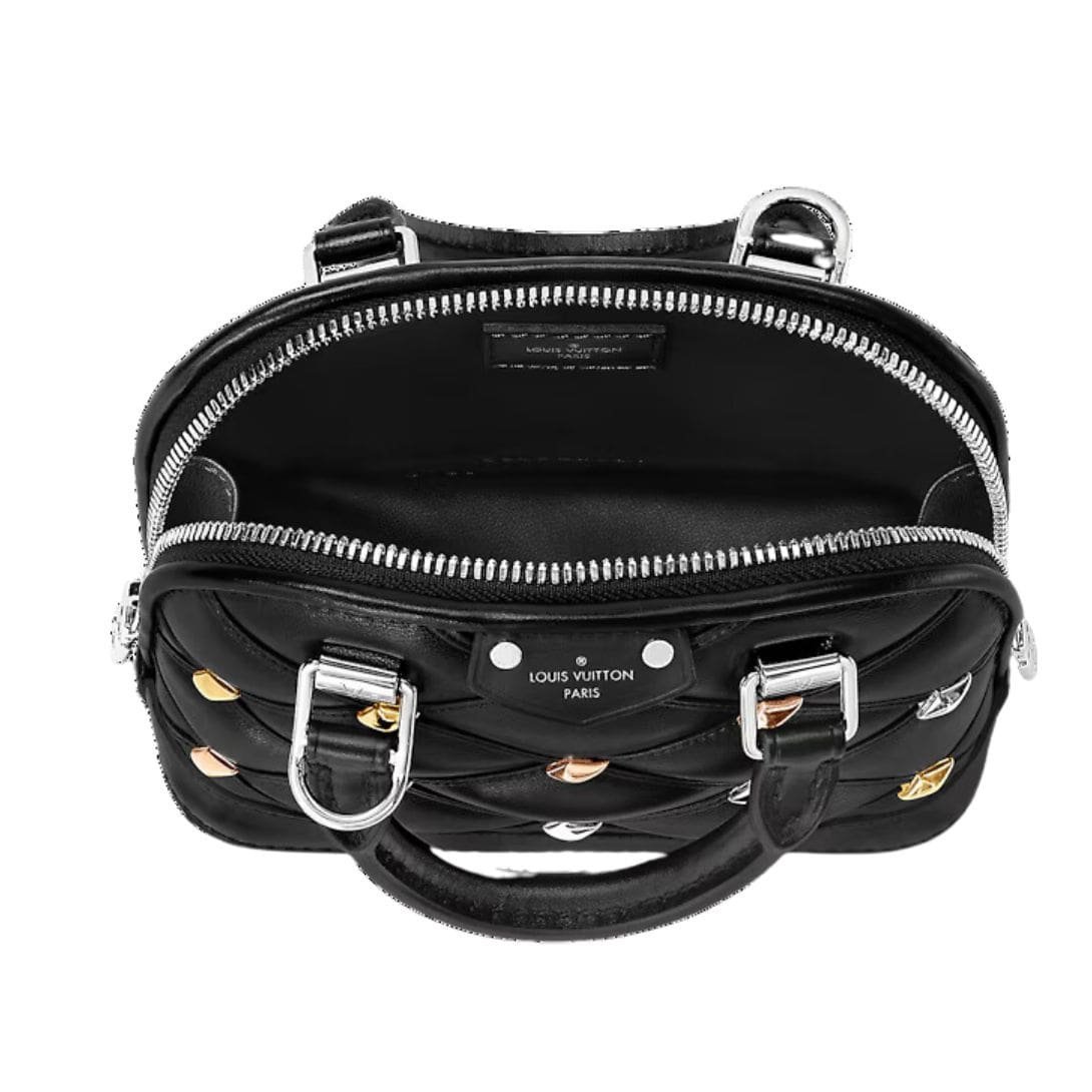 Measuring a petite 7.1 x 4.7 x 3.1 inches, the LOUIS VUITTON NANO ALMA exudes understated glamour in classic black, complemented by lambskin trim and opulent gold and silver-color hardware. The meticulous attention to detail is further enhanced by tiny studs in gold- and silver-tone metal, adding a subtle yet captivating allure to the bag.