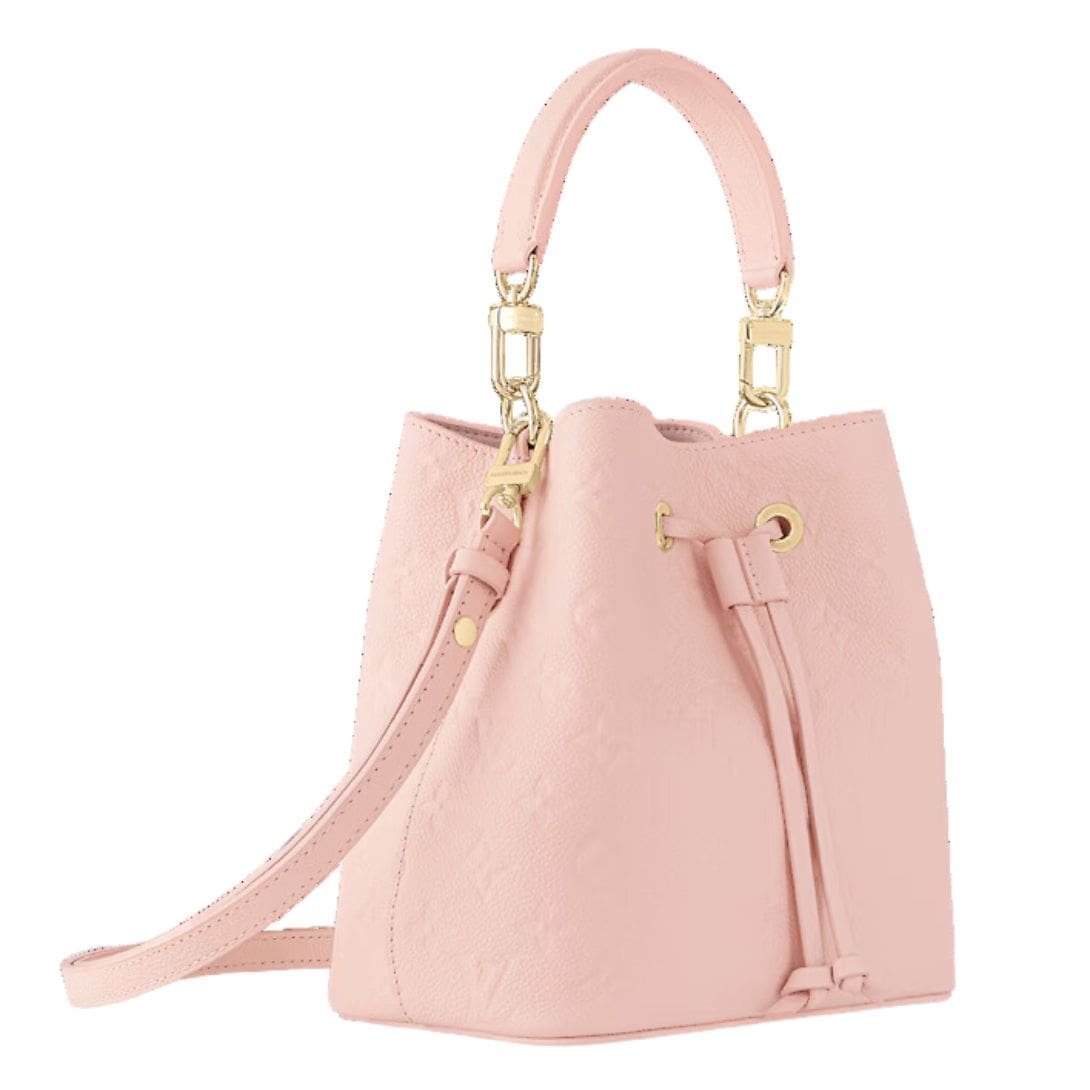 Indulge in understated elegance with the LOUIS VUITTON NEONOE BB bucket bag, crafted from luxurious Monogram Empreinte cowhide leather in a delicate opal pink hue. This compact yet versatile accessory exudes sophistication with its soft and supple texture, enhanced by the subtle Monogram embossing and pale-gold-color hardware.