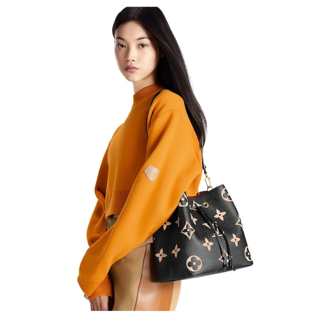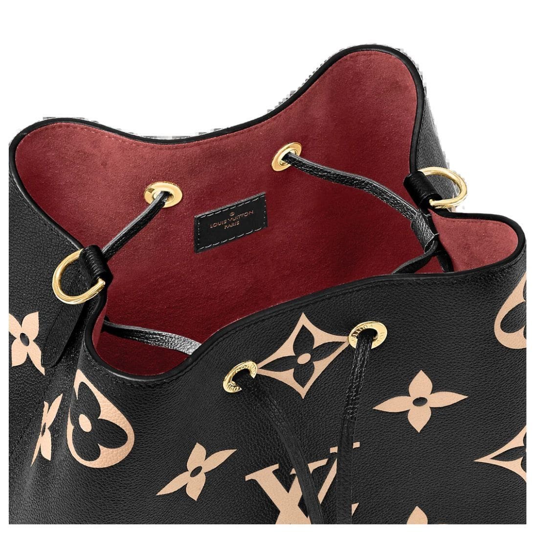 Measuring 10.2 x 10.2 x 6.9 inches, the LOUIS VUITTON NEONOE MM epitomizes versatility and functionality in classic black/beige, complemented by grained cowhide-leather trim and gold-color hardware that adds a touch of luxury to the design. The microfiber lining enhances its refined aesthetic, while the metal eyelets add a hint of modernity to the overall look.