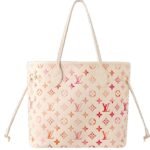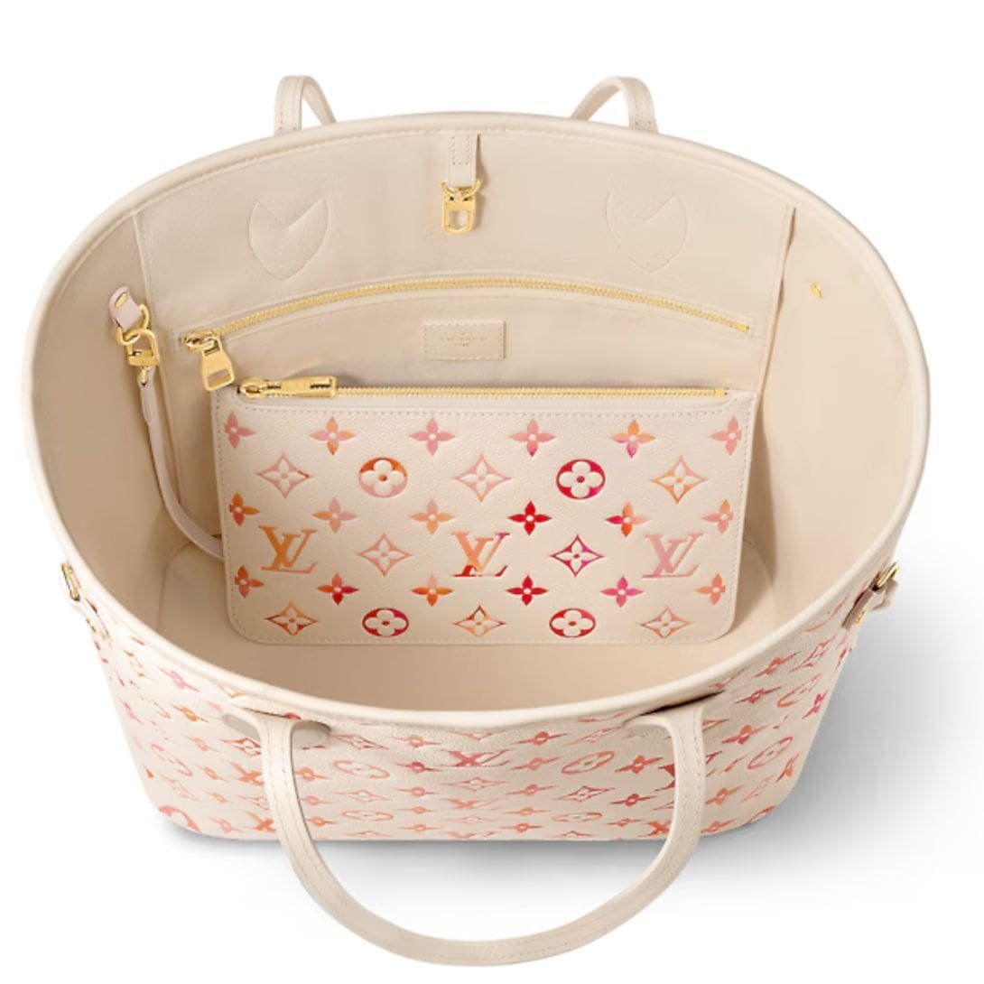 Presenting the LOUIS VUITTON NEVERFULL MM tote bag from Louis Vuitton, reimagined in the exquisite Monogram Empreinte Sunrise Aquarelle leather. This stunning piece features a distinctive gradient treatment of orange, pink, and fuchsia hues, printed atop the iconic Monogram embossing, evoking a sense of joy and vibrancy.