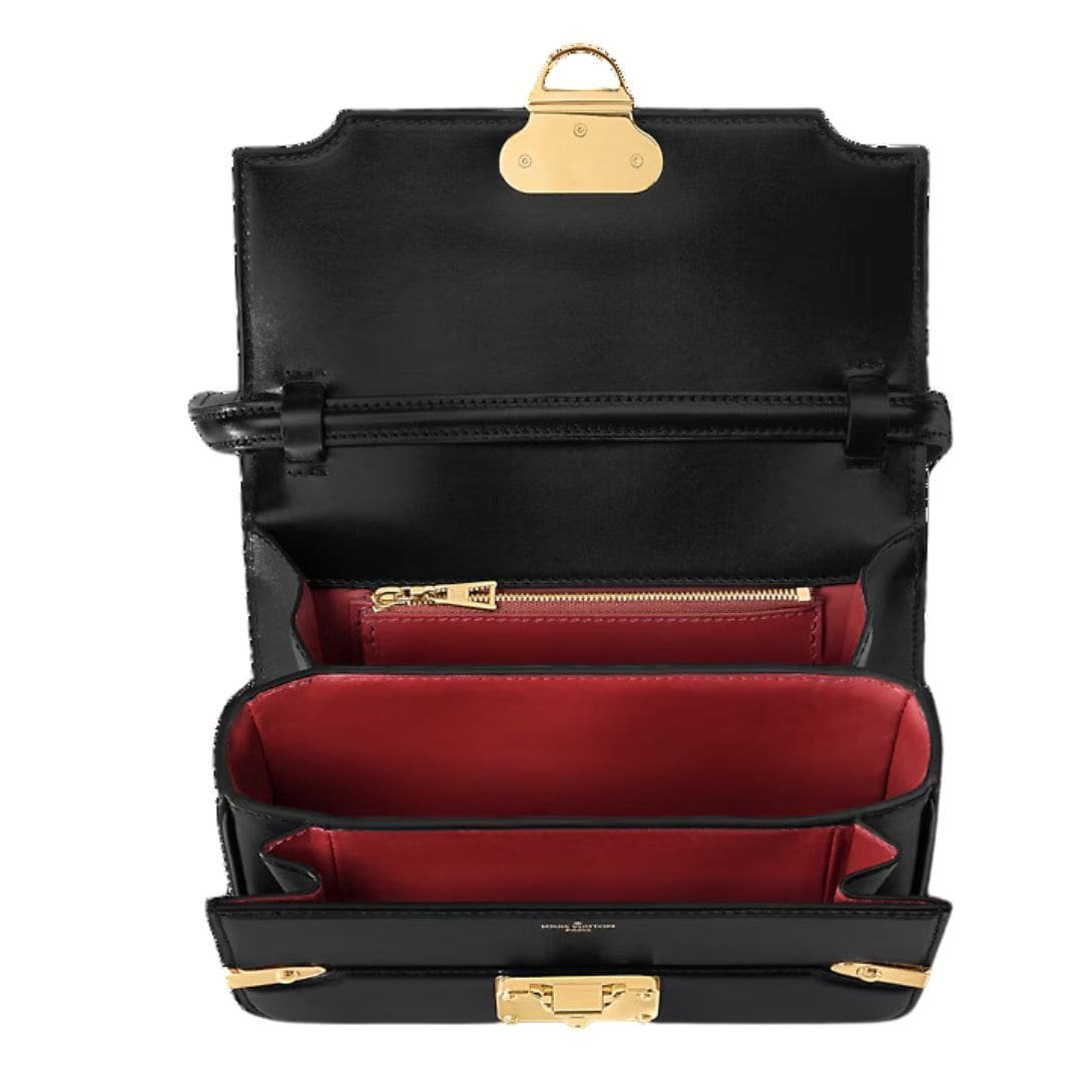The bag features gold-color hardware, including the iconic N-Lock and metallic side brackets, paying homage to Louis Vuitton’s rich heritage. The contrasting lining creates a surprising inside-outside effect, adding a touch of modernity to its design.
