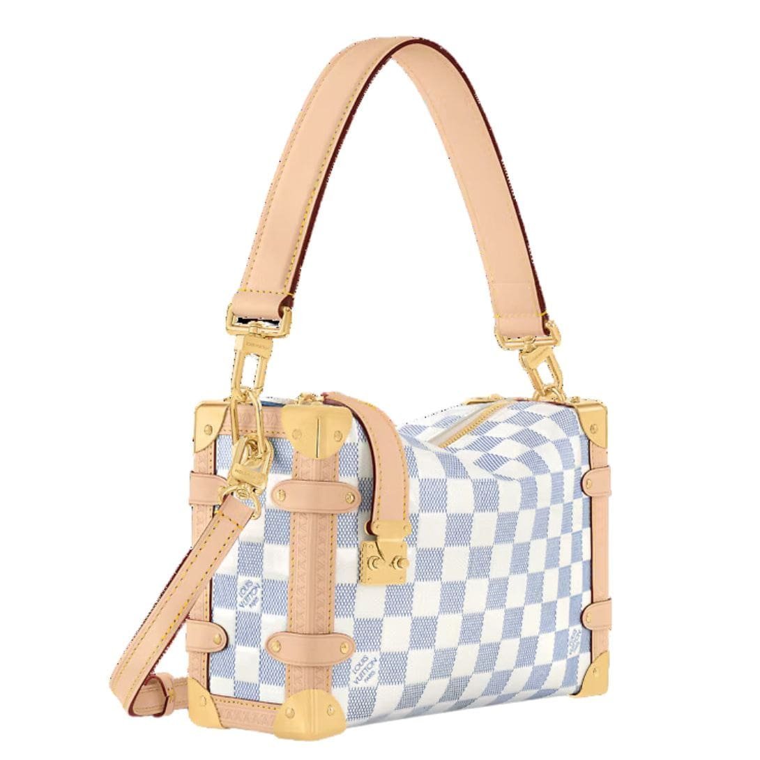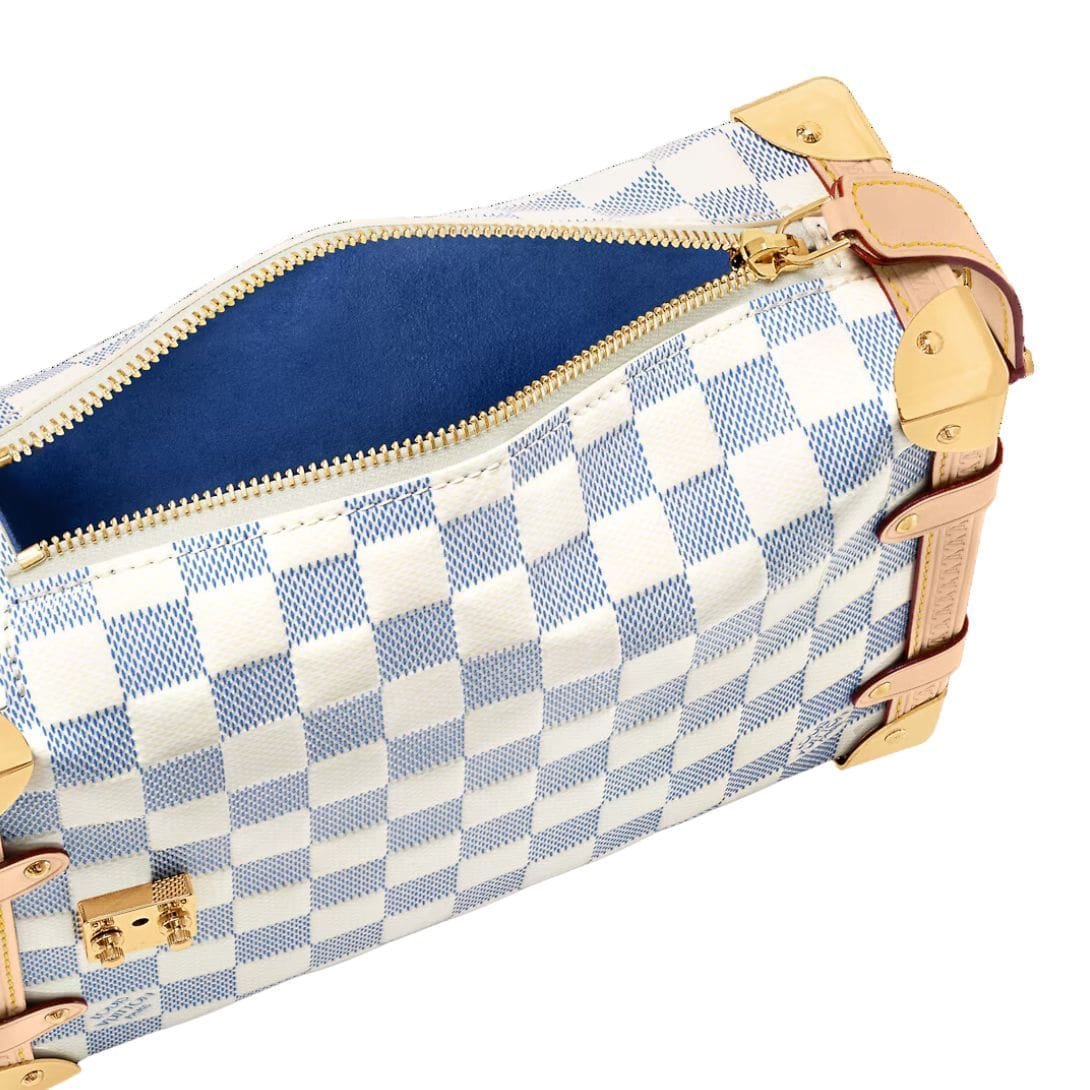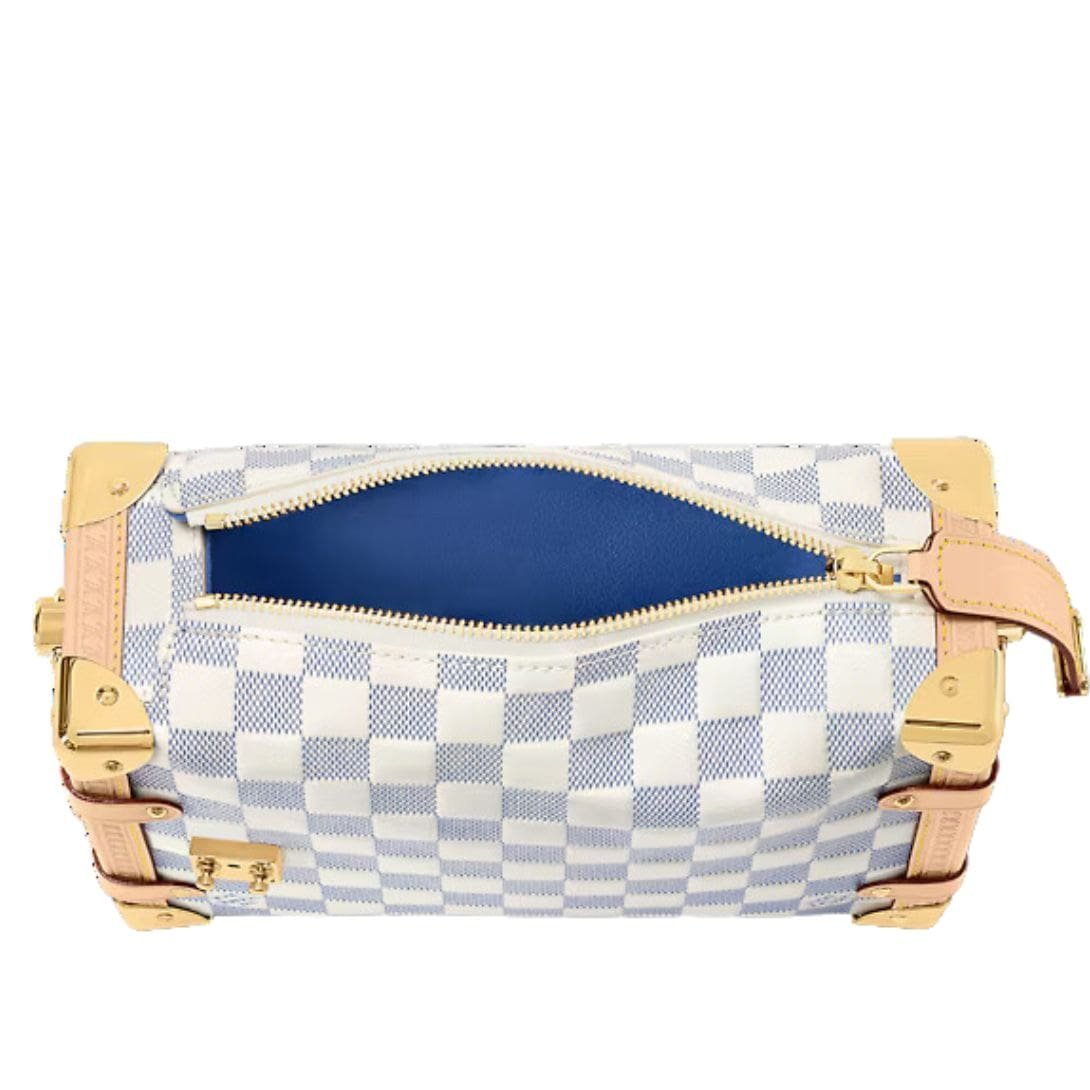 Experience the whimsical elegance of Nicolas Ghesquière’s Side LOUIS VUITTON SIDE TRUNK MM , now presented in a charming Celeste Blue hue and adorned with luxurious Damier Vernis calfskin and natural cowhide trim. This playful reinterpretation of a Louis Vuitton classic embodies creativity and sophistication, perfect for the modern fashion enthusiast.