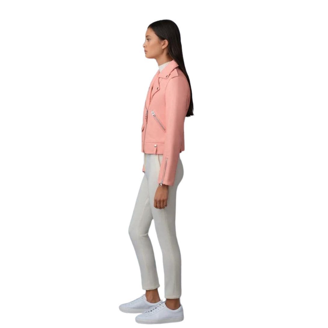 The Mackage Baya (r) Leather Biker Jacket is a women’s biker jacket crafted from supple, sustainable (R) Leather. Designed with a straight silhouette, it features a classic asymmetrical zip front closure and a snap-notch collar. Its relaxed fit and action back provide ease of movement, making it perfect for effortless layering. The jacket is finished with signature silver hardware and zip pockets for a timeless, stylish look.