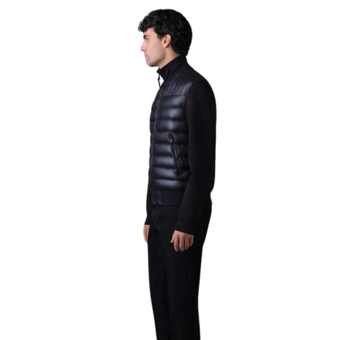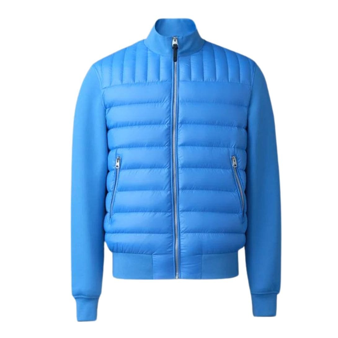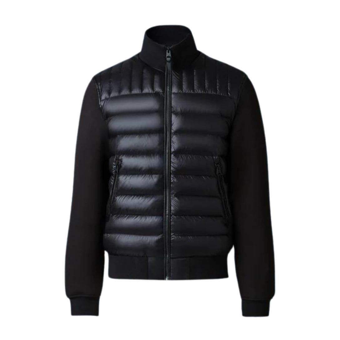 Introducing the Mackage Collin-R Nano Down Mixed Media Bomber Jacket is a transitional jacket for men featuring a classic bomber style. Meticulously tailored to a slim fit, it showcases a recycled lustrous nano down front complemented by soft double-face jersey sleeves and back. The rib knit stand collar and trims provide both tactical detailing and warmth, making it a contemporary multi-seasonal layer with effortless elegance.