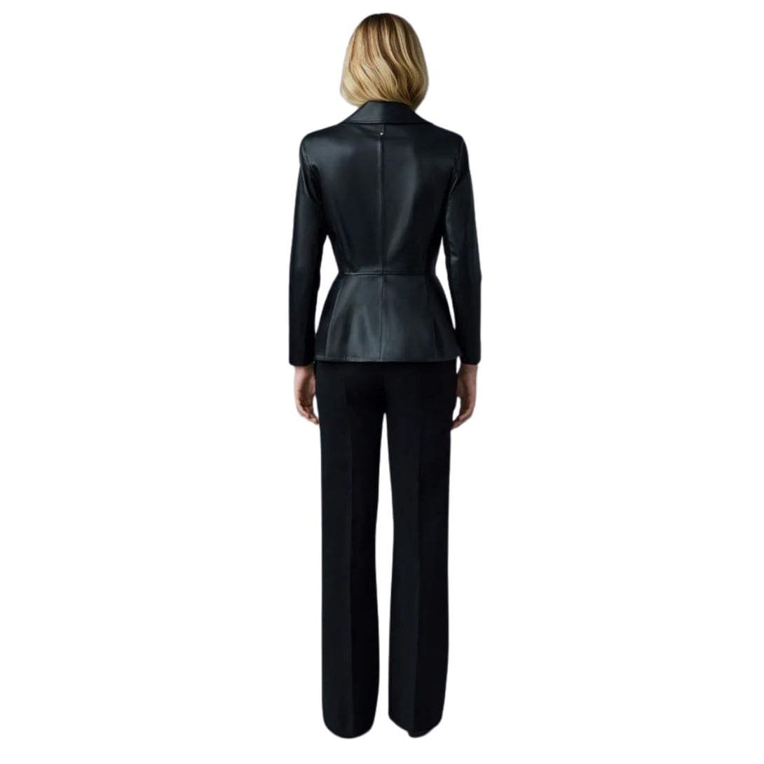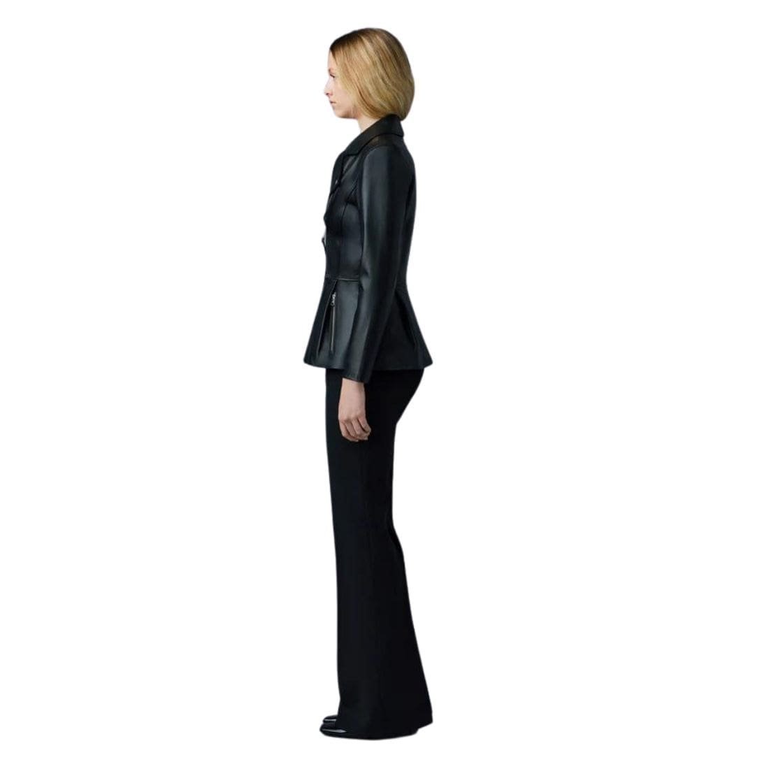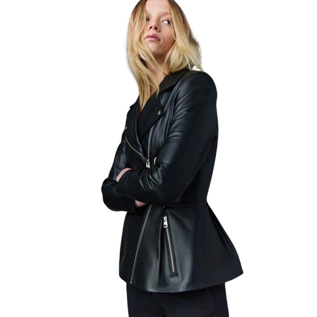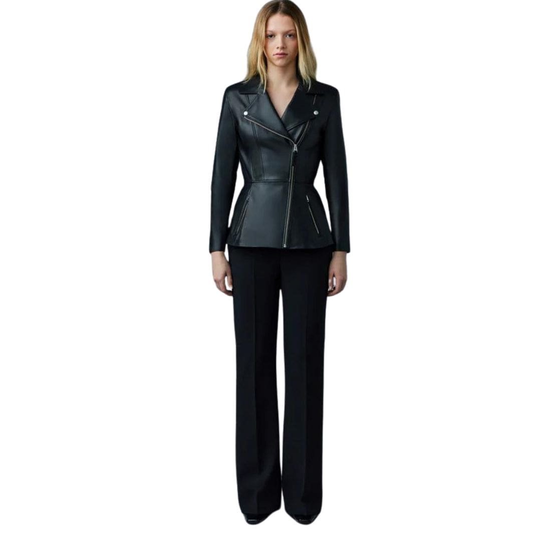 Introducing Mackage Day Leather Biker Jacket with Peplum, a classic biker jacket expertly tailored from supple and sustainable lamb leather. This form-fitting jacket features a pleated peplum with a subtle flounce, giving it a distinctive silhouette. Structured shoulders with pads enhance the sculptural look, while back-sleeve rib inserts provide perfect comfort. A luxurious, ultra-chic style icon.
