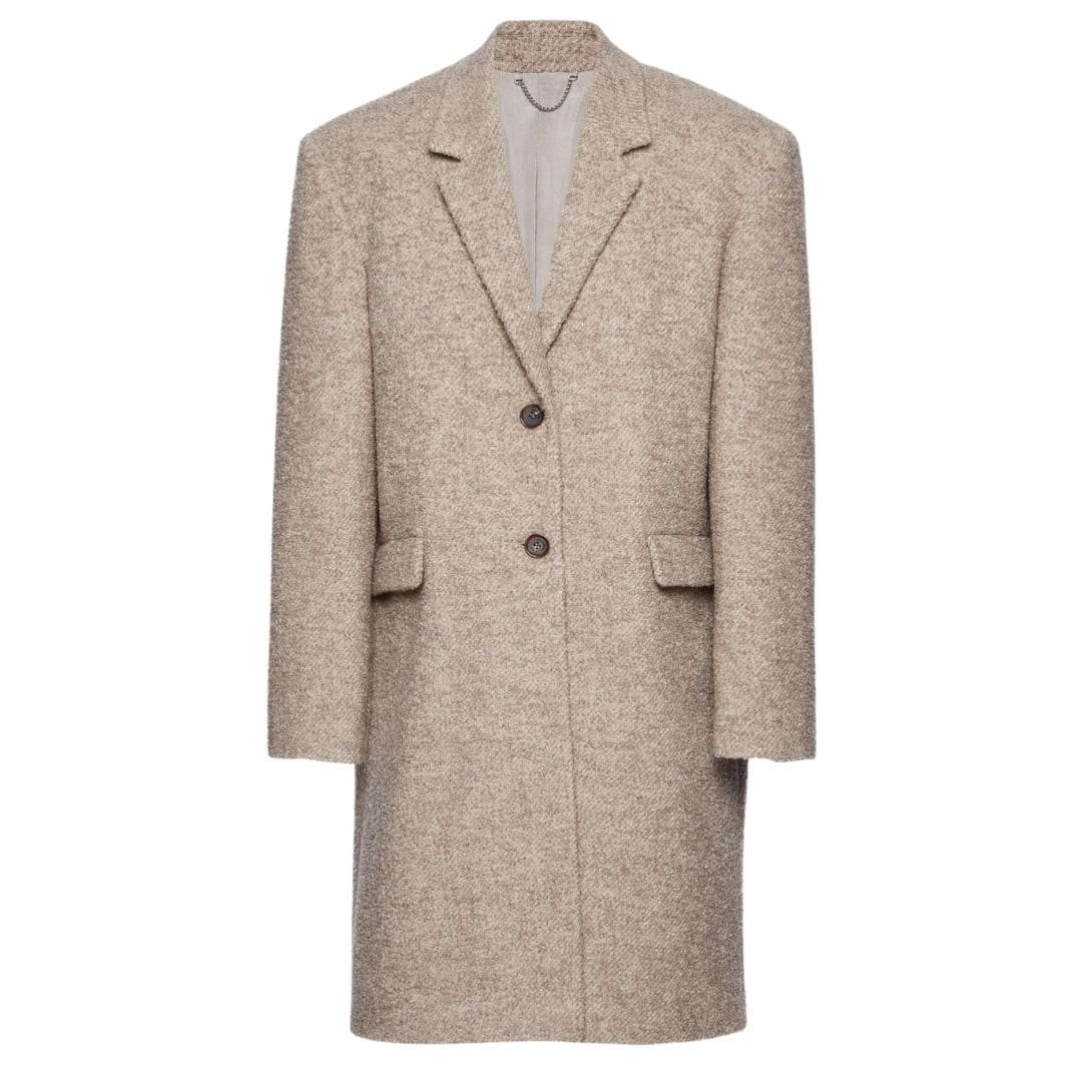 Designed to hit just below the knee, this coat exudes sophistication with its timeless silhouette. The straight, oversized fit adds a modern twist to the classic menswear-inspired design, allowing for ease of movement and layering.