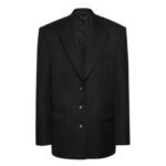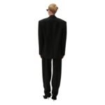 In conclusion, Magda Butrym’s signature oversized blazer in black wool is a masterful blend of classic and contemporary elements. Its strong shoulders and boyfriend fit create a chic and modern look, while the luxurious black wool fabric ensures it remains a timeless tailoring staple. This blazer is a versatile and sophisticated piece that can effortlessly elevate any outfit, making it an indispensable addition to any fashion-forward wardrobe.