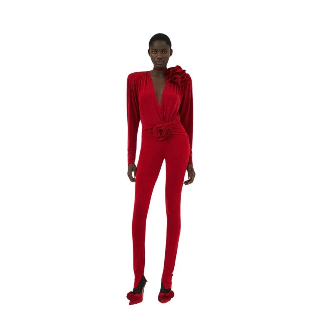 Magda Butrym Classic shirred flower blouse in Red epitomizes romantic sophistication. It boasts a billowing silhouette that exudes elegance, enhanced by a graceful V neckline with a discreet button closure. The long sleeves add to its flowing aesthetic, ensuring a flattering fit for various body types.