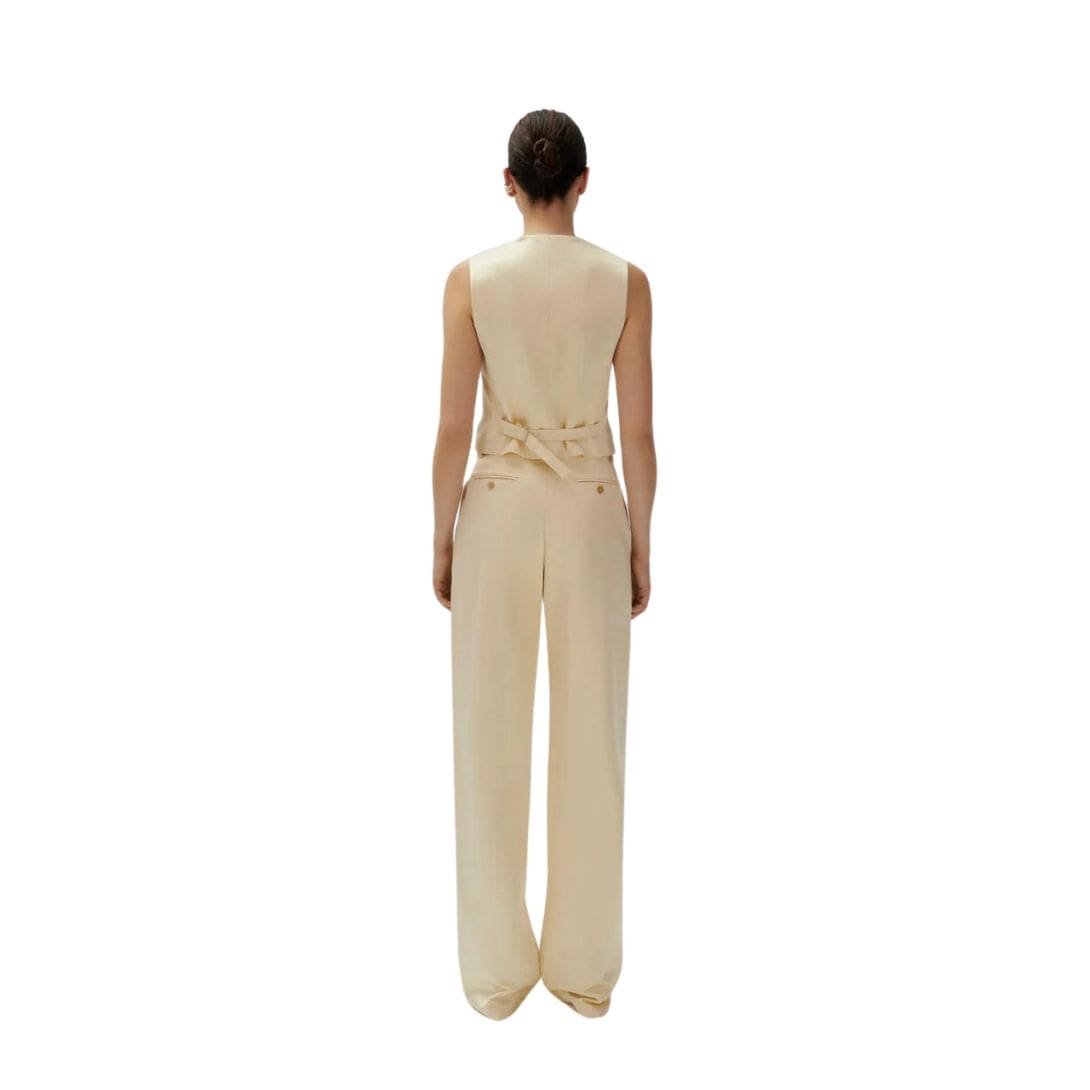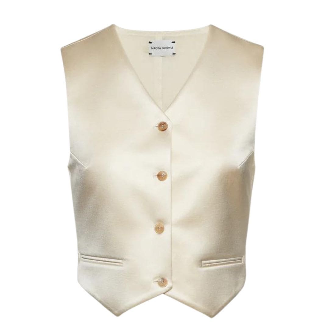In summary, the Magda Butrym classic waistcoat in cream is a must-have for anyone seeking a blend of classic tailoring and modern versatility. Its high-cut V neckline, button-down front, and adjustable waist make it a stylish and functional addition to any fashion-forward wardrobe.