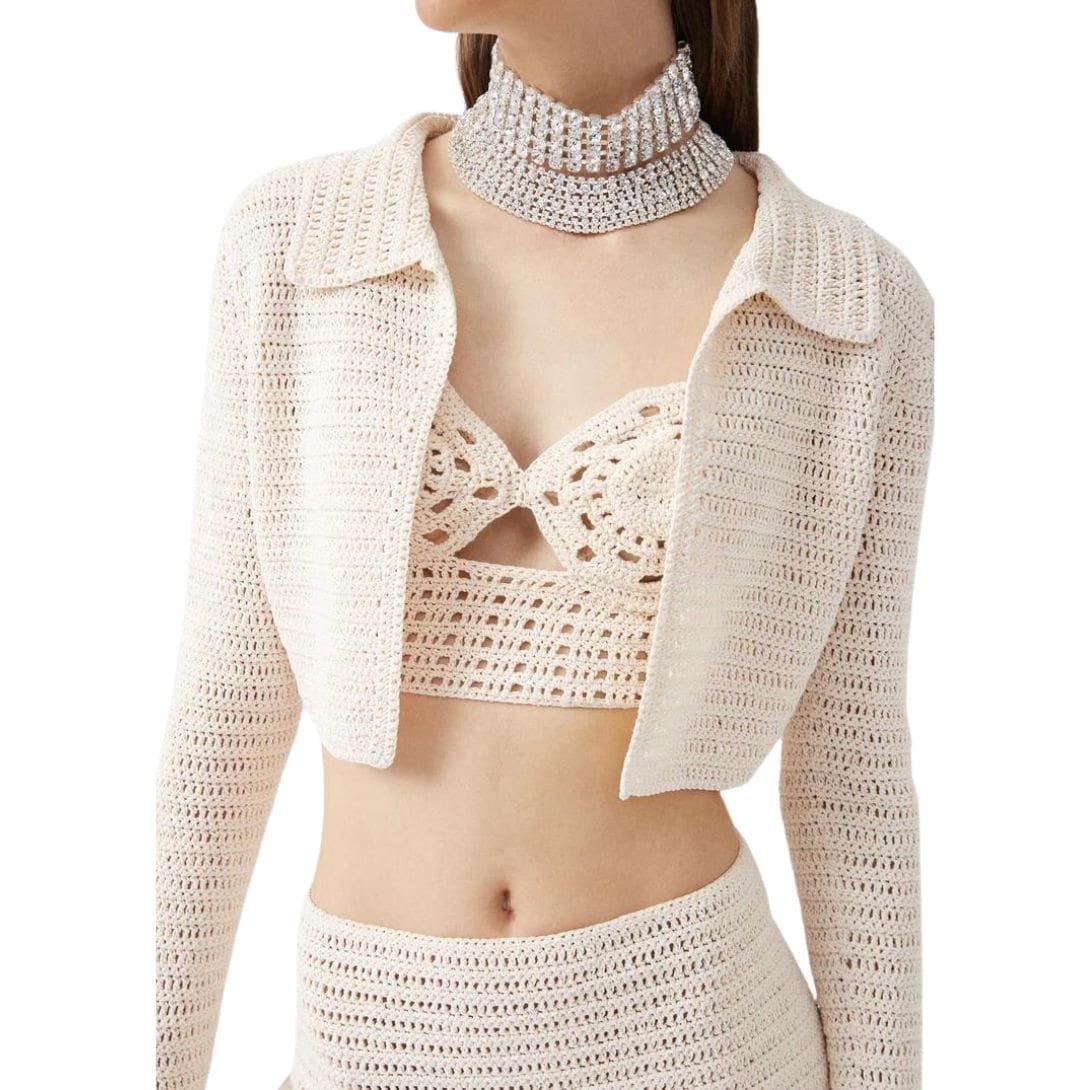 The Magda Butrym Crochet Cropped Bolero Jacket in Cream. is a stunning testament to the brand’s commitment to craftsmanship and sophisticated design. This exquisite piece is a signature style from Magda Butrym, embodying the intricate crocheting techniques that have become synonymous with the brand’s aesthetic. The result is a beautifully crafted jacket that combines traditional craftsmanship with contemporary fashion.