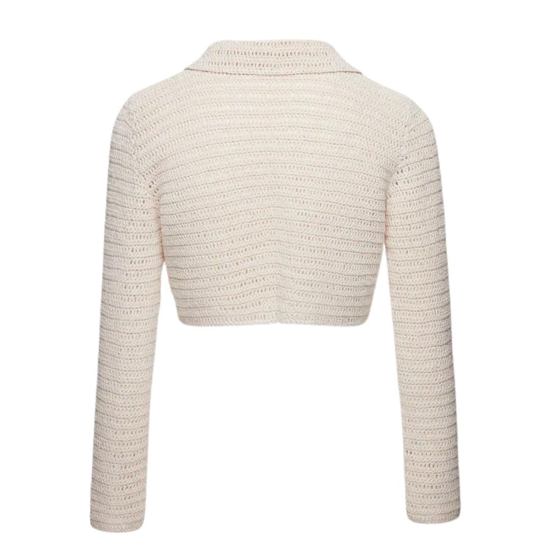 In conclusion, the Magda Butrym Crochet Cropped Bolero Jacket in Cream is a remarkable piece that embodies the brand’s dedication to craftsmanship and modern design. Its intricate crochet work, cropped silhouette, open front, and detailed collar make it a standout item that can elevate any outfit. This jacket is a perfect example of how traditional techniques can be reimagined in contemporary fashion, resulting in a timeless and elegant piece that is both versatile and chic.