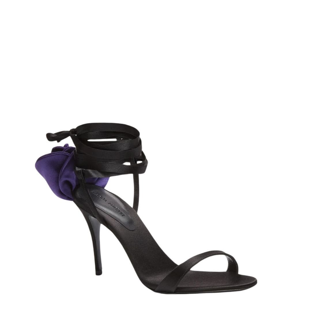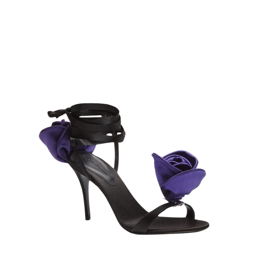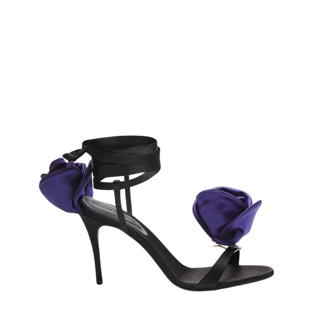 Be the first to review “MAGDA BUTRYM DOUBLE PURPLE FLOWER HEEL SANDALS IN BLACK SATIN” Cancel reply