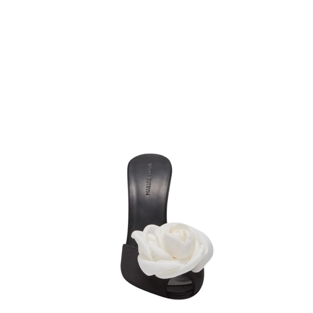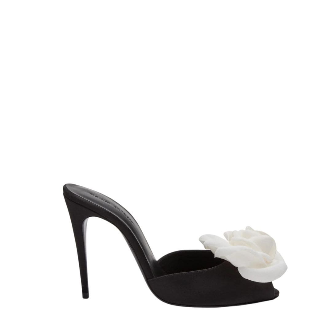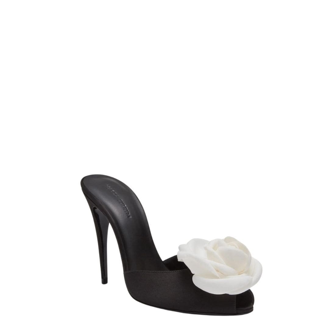 MAGDA BUTRYM FLOWER PEEP TOE MULES IN BLACK SATIN