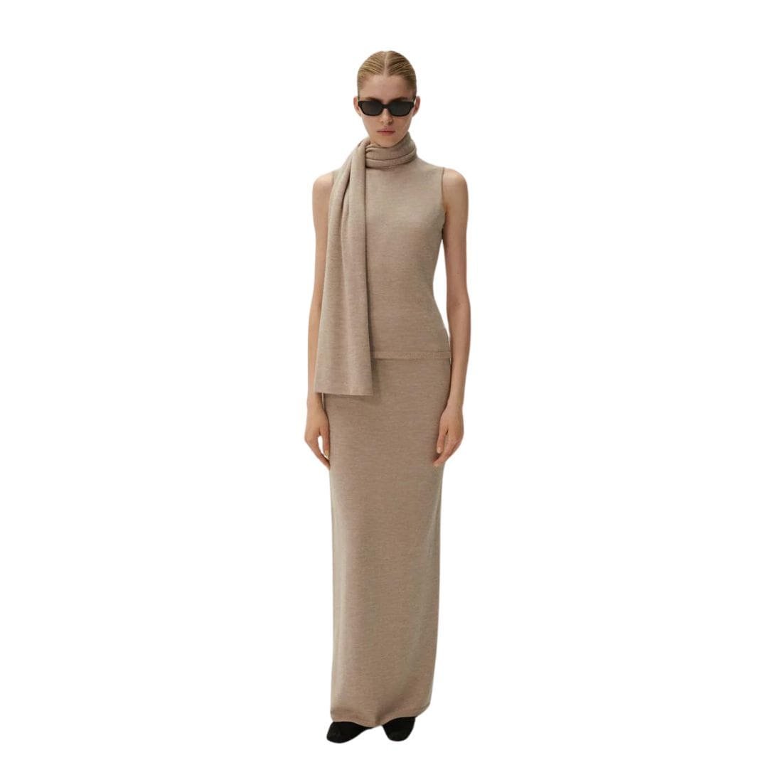 Magda Butrym knitwear maxi skirt in beige offers a minimalist approach with its straight fit and luxurious blend of wool, silk, and cashmere. This combination of materials ensures a soft and comfortable feel against the skin, while also providing warmth and a touch of luxury.