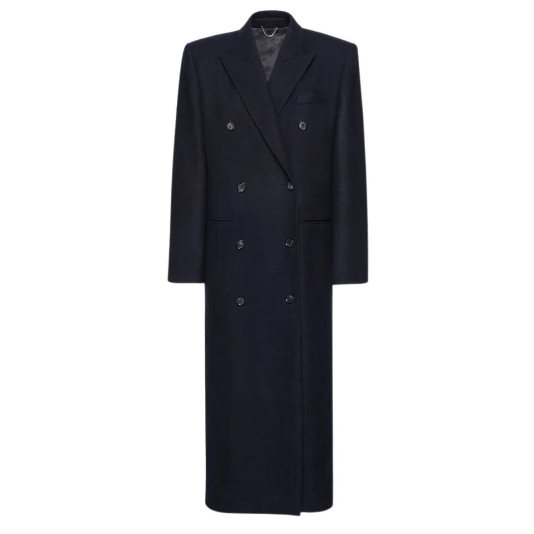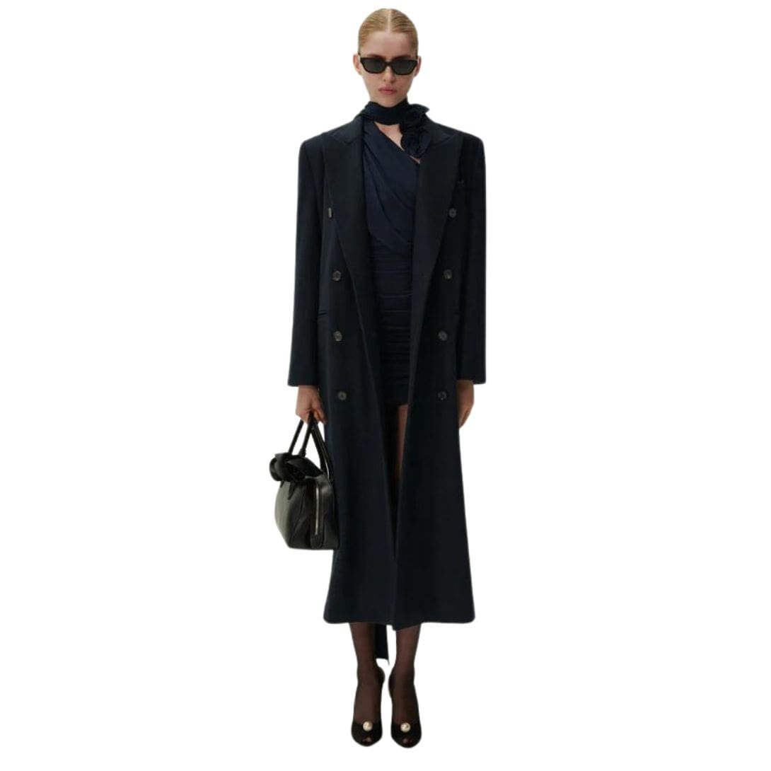 Step into timeless elegance with Magda Butrym Long Classic Wool In Navy. a classic garment that effortlessly combines masculine inspiration with feminine sophistication. Crafted from premium wool, this coat exudes quality craftsmanship and luxurious warmth, making it a staple piece in any winter wardrobe.