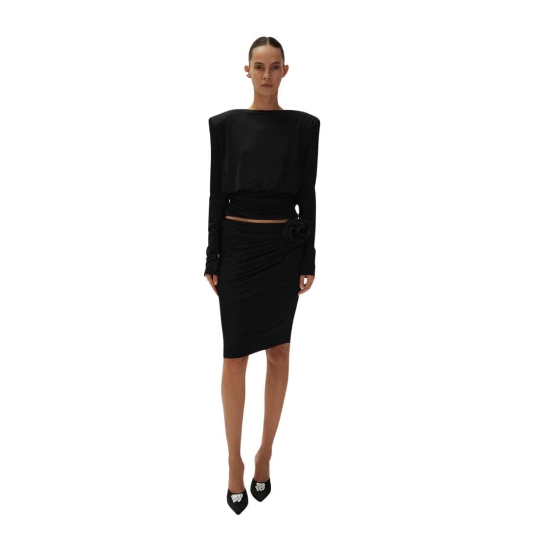 In summary, Magda Butrym’s black long sleeve draped jersey blouse is a versatile and stylish addition to any wardrobe. Its draped neckline, long sleeves, and removable shoulder pads offer a blend of comfort and sophistication, making it a go-to choice for chic and polished looks.
