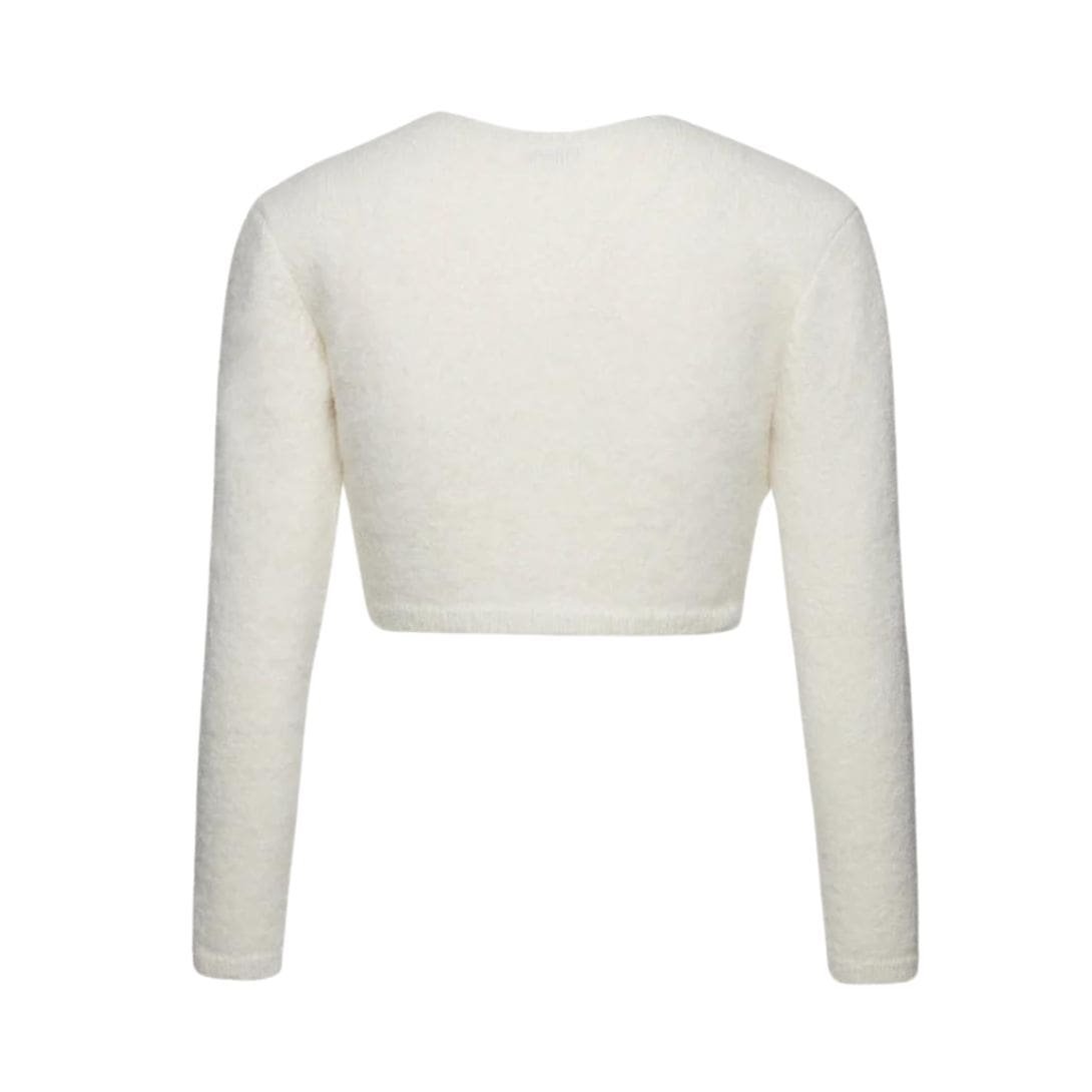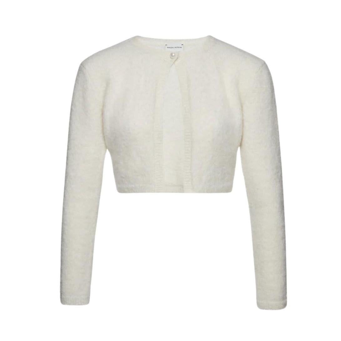 In summary, this cropped round neck cardigan knit from mohair and alpaca, featuring a single pearl button closure, combines comfort with understated elegance. Whether worn as a statement piece or layered for added warmth, it embodies versatility and timeless style, making it a wardrobe essential for any fashion-forward individual.
