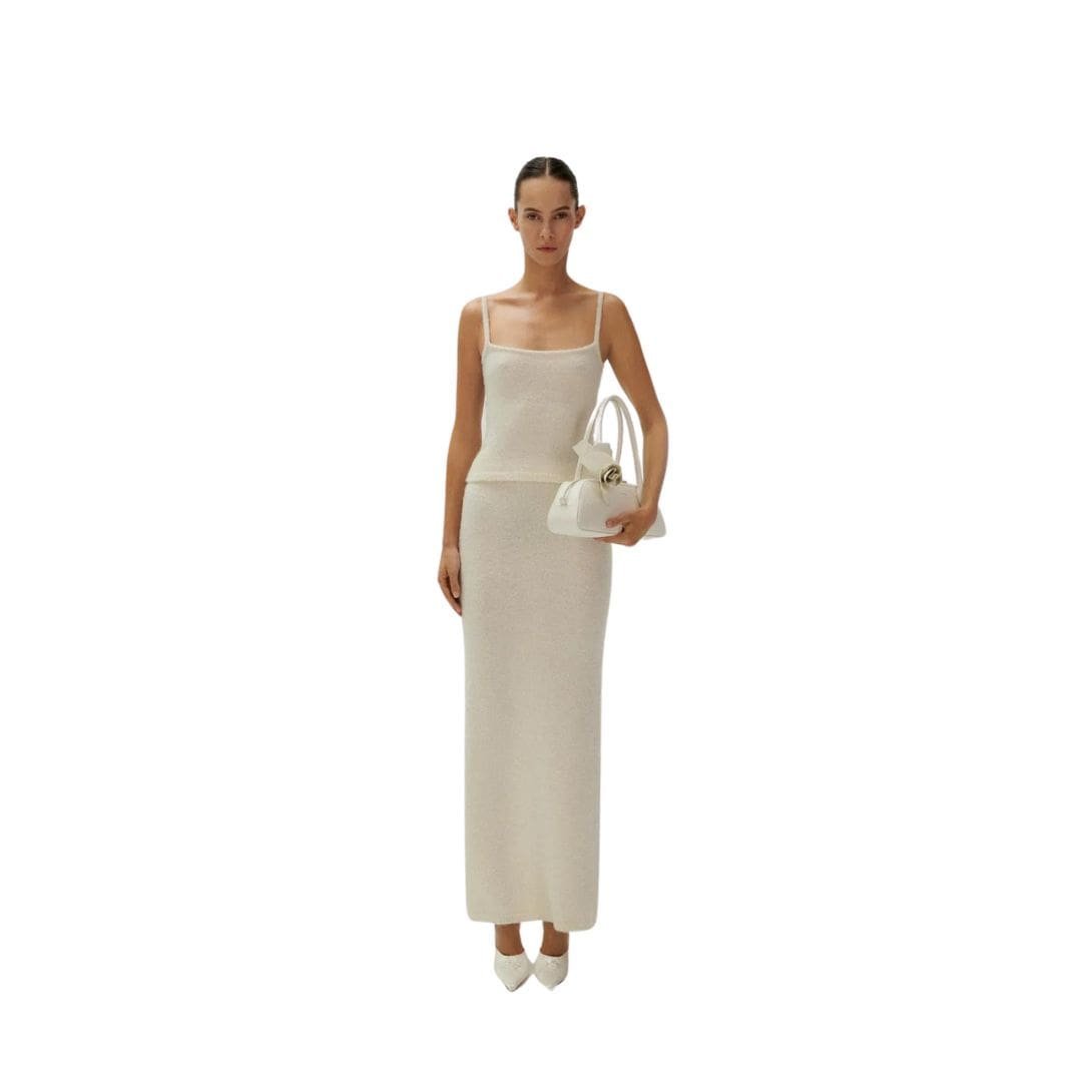 MADGA BUTRYM mohair blend knit tank top in cream of mohair and alpaca, epitomizes understated elegance. Designed with a straight fit, it gracefully drapes to the ankle, creating a streamlined and minimalist silhouette.