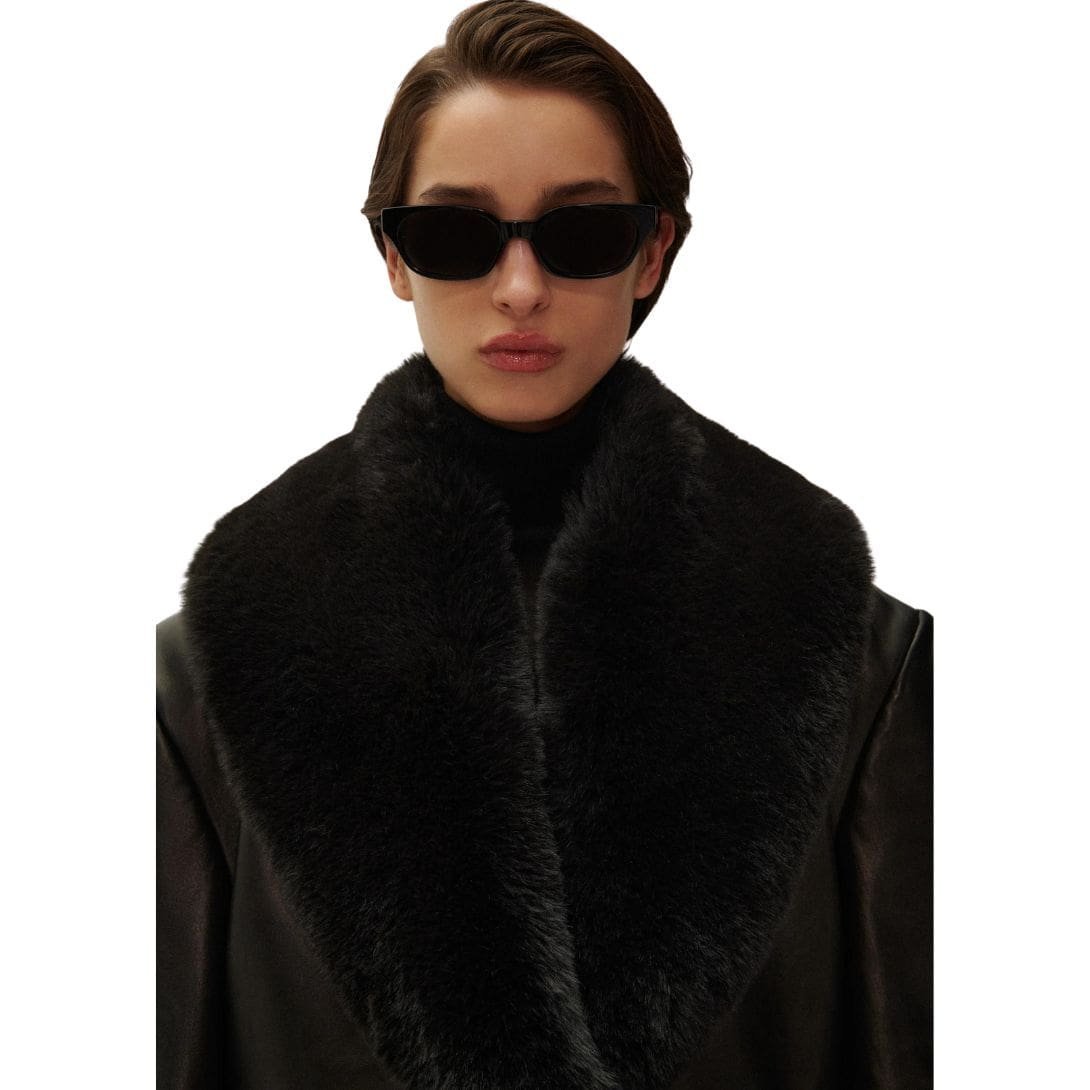 Introducing MAGDA BUTRYM OVERSIZED CLASSIC MIDI COAT IN BLACK LEATHER WITH FAUX FUR that seamlessly blends classic features with contemporary sophistication, embodying the timeless elegance synonymous with Magda Butrym’s signature style. Crafted with meticulous attention to detail, this coat is designed to evoke the brand’s iconic signatures, reminiscent of classic coats and tailored blazers.