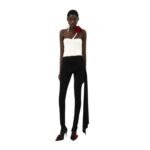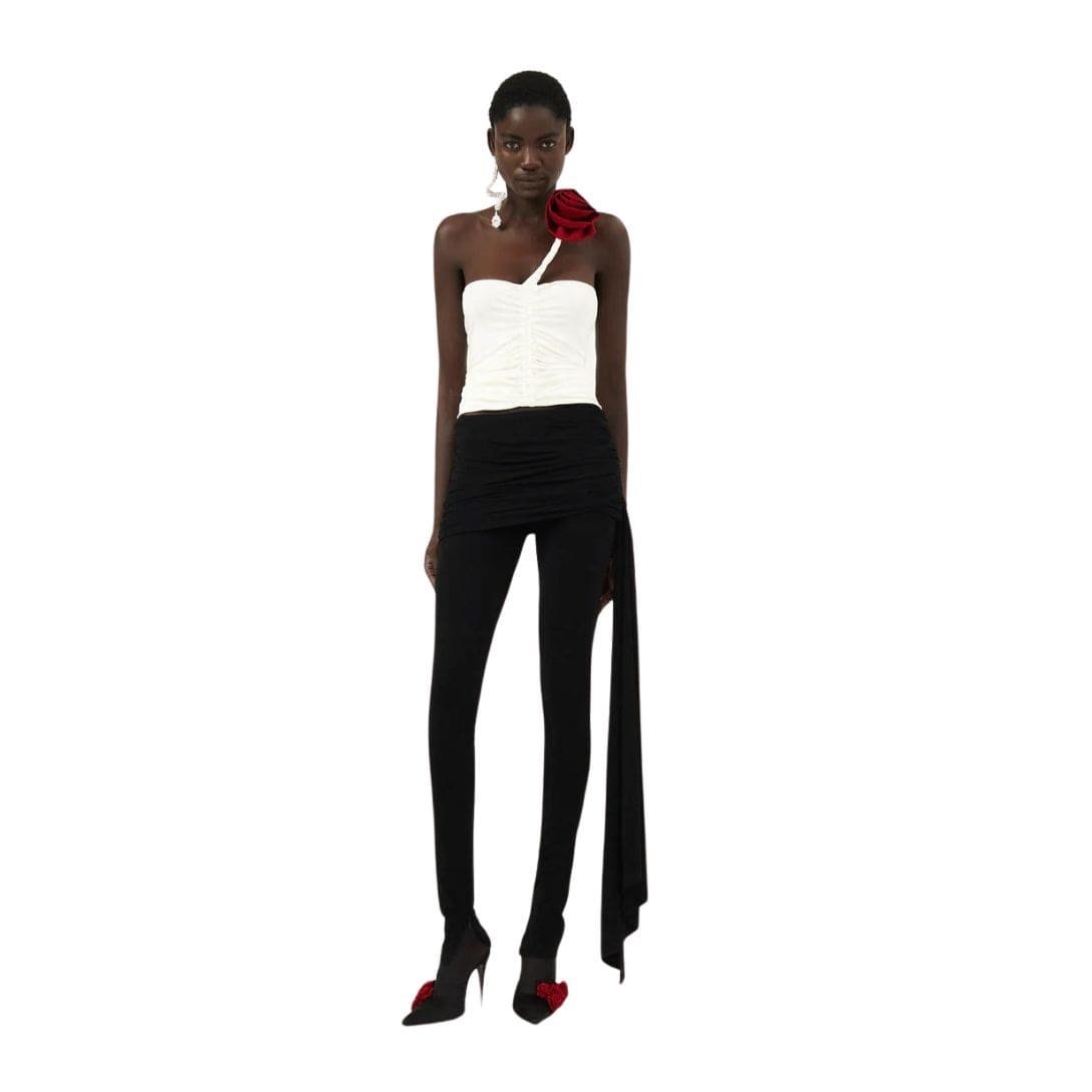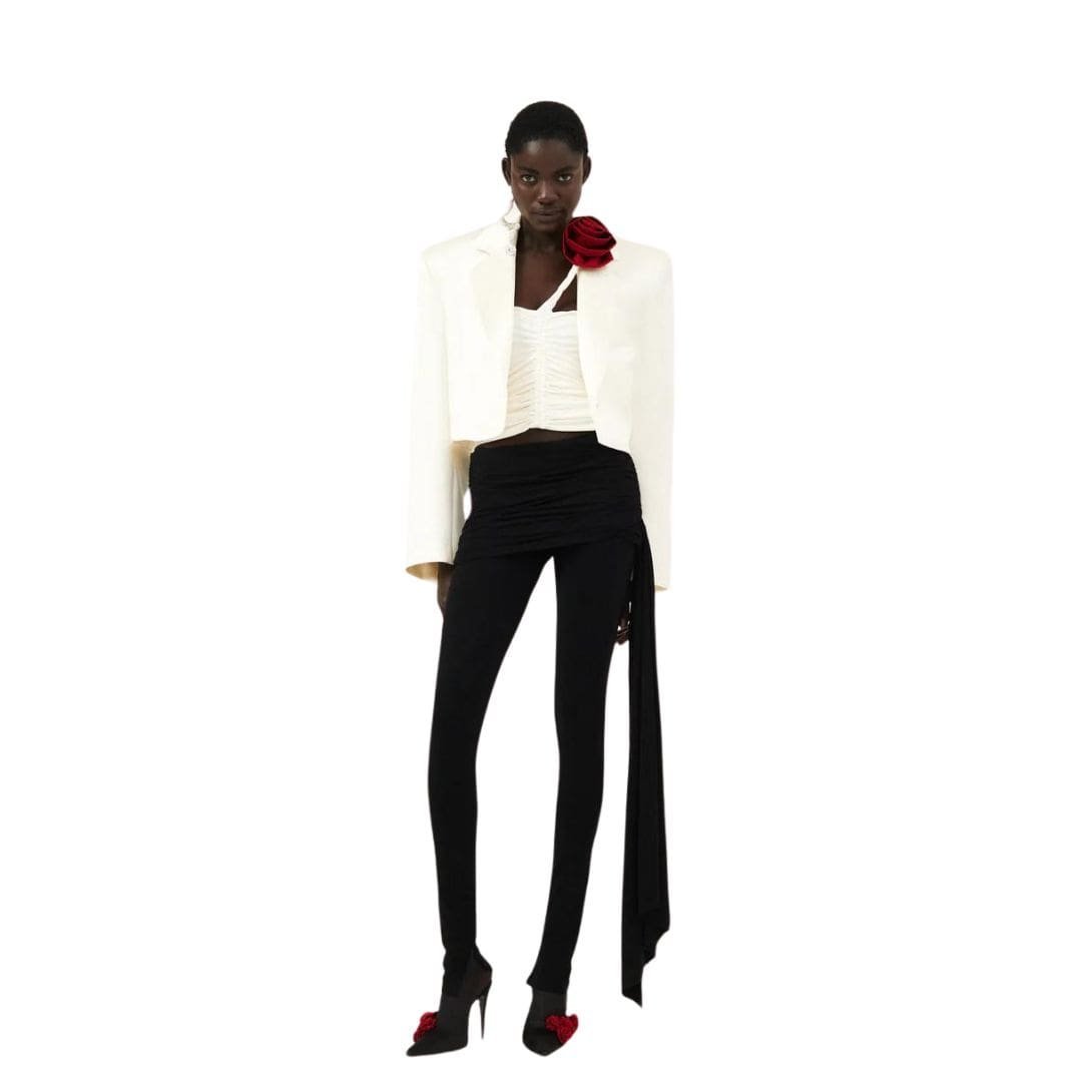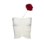 In summary, Magda Butrym’s ruched jersey one-shoulder top in cream is a beautifully crafted piece that combines contemporary style with romantic embellishments. Its unique design, flattering ruching, and striking red rose appliqué make it a versatile and elegant addition to any collection.