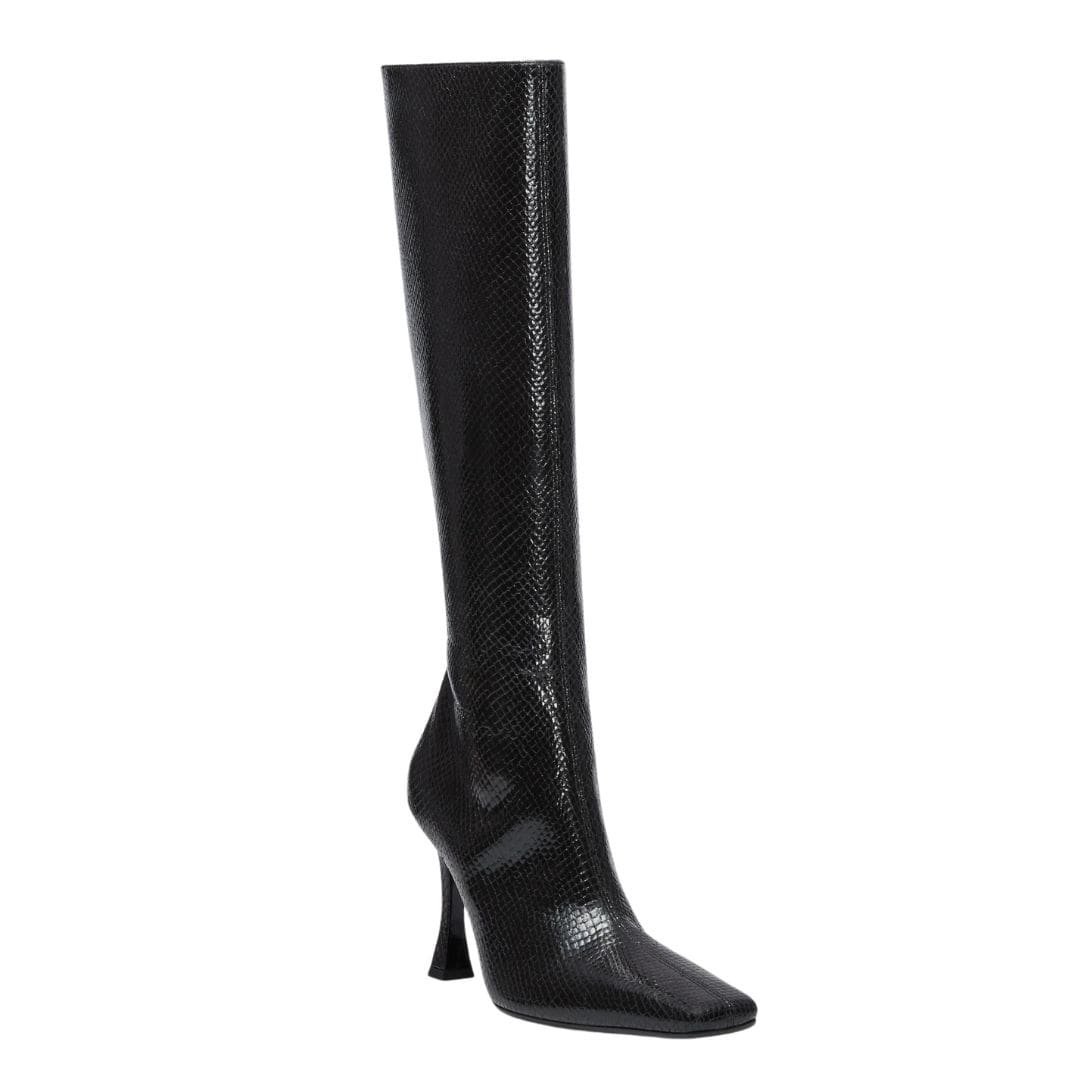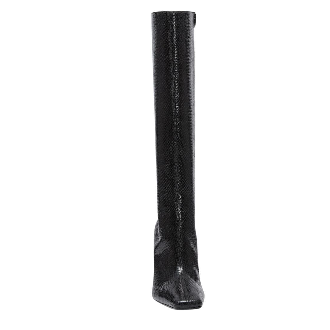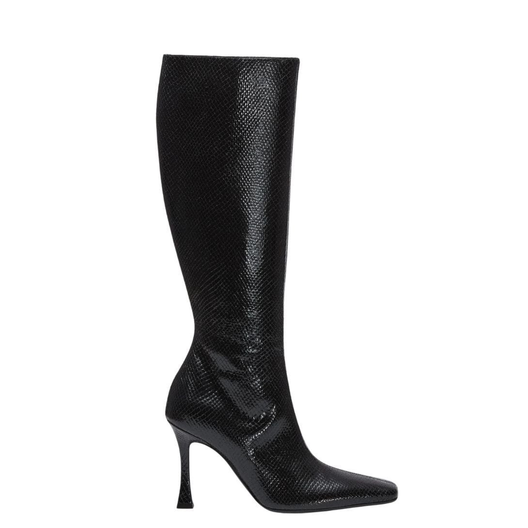 Furthermore, the 10cm angular heel adds height and allure, elongating the legs and commanding attention with its bold silhouette. Despite its height, the heel is designed for stability and comfort, allowing you to strut with confidence and poise wherever you go. Whether paired with skinny jeans for a casual daytime look or a sleek mini dress for a night out, these boots are sure to make a statement with their effortless glamour.