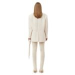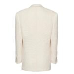 The Magda Butrym Tailored Oversized Handwoven Blazer in cream. represents the epitome of luxury and craftsmanship, redefining the classic oversized blazer with unparalleled attention to detail and impeccable design. Crafted from handwoven fabric, this statement piece showcases Magda Butrym’s dedication to artistry and innovation.