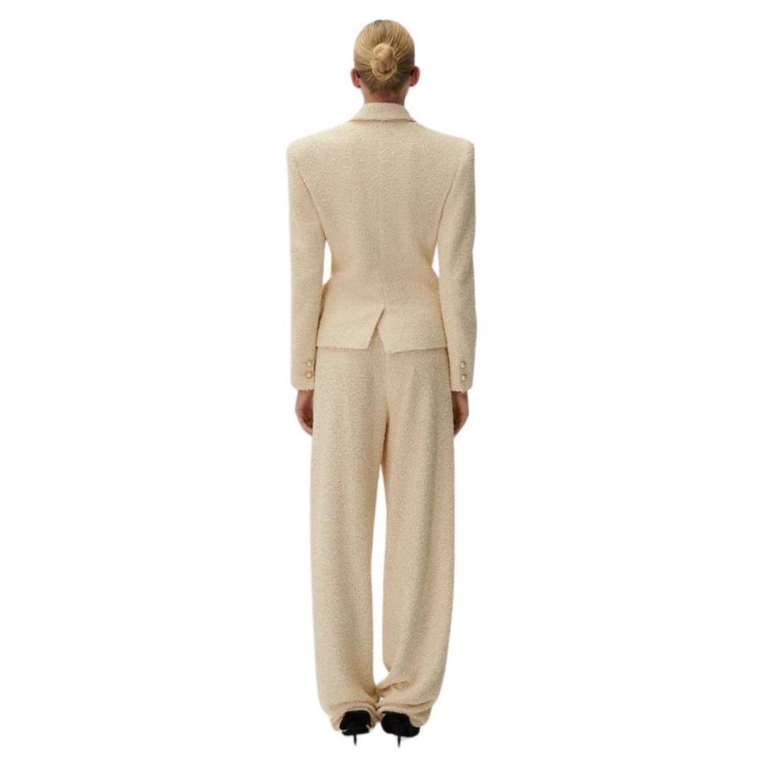 The bouclé finish lends a vintage-inspired charm to these pants, adding an element of timeless sophistication to your ensemble. Bouclé, with its looped yarns and distinctive texture, evokes a sense of luxury and refinement, elevating these pants into a statement piece in your wardrobe. This vintage touch adds character and personality to your look, making these pants stand out from the crowd with their unique aesthetic appeal.
