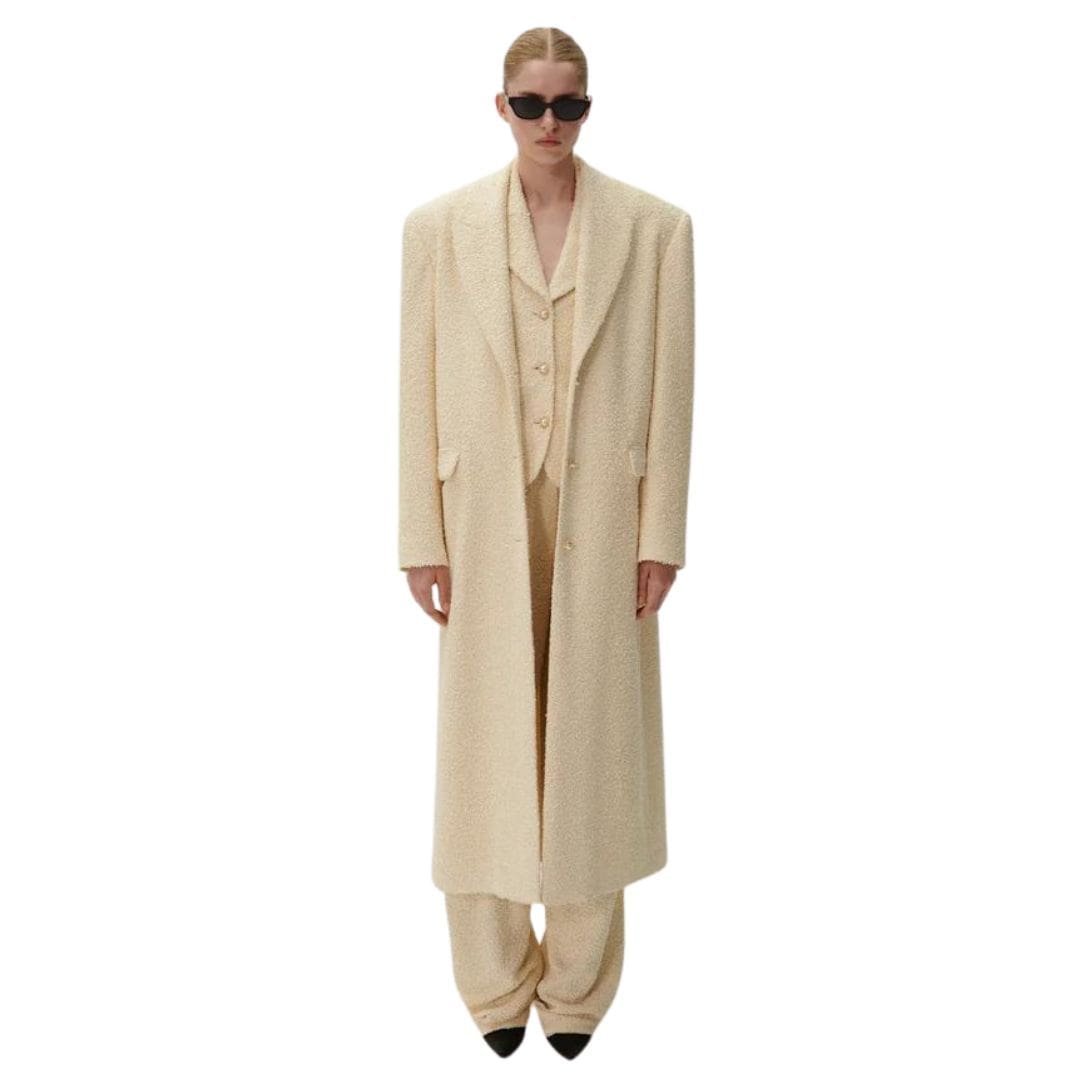 Whether you’re heading to the office, meeting friends for brunch, or attending a special event, these wide-leg bouclé pants in beige are the epitome of effortless sophistication. Their timeless design, paired with their vintage-inspired bouclé finishing, makes them a standout piece that will elevate any outfit with a touch of understated elegance. Add them to your wardrobe rotation and discover endless styling possibilities with these versatile and stylish pants.