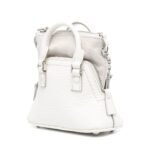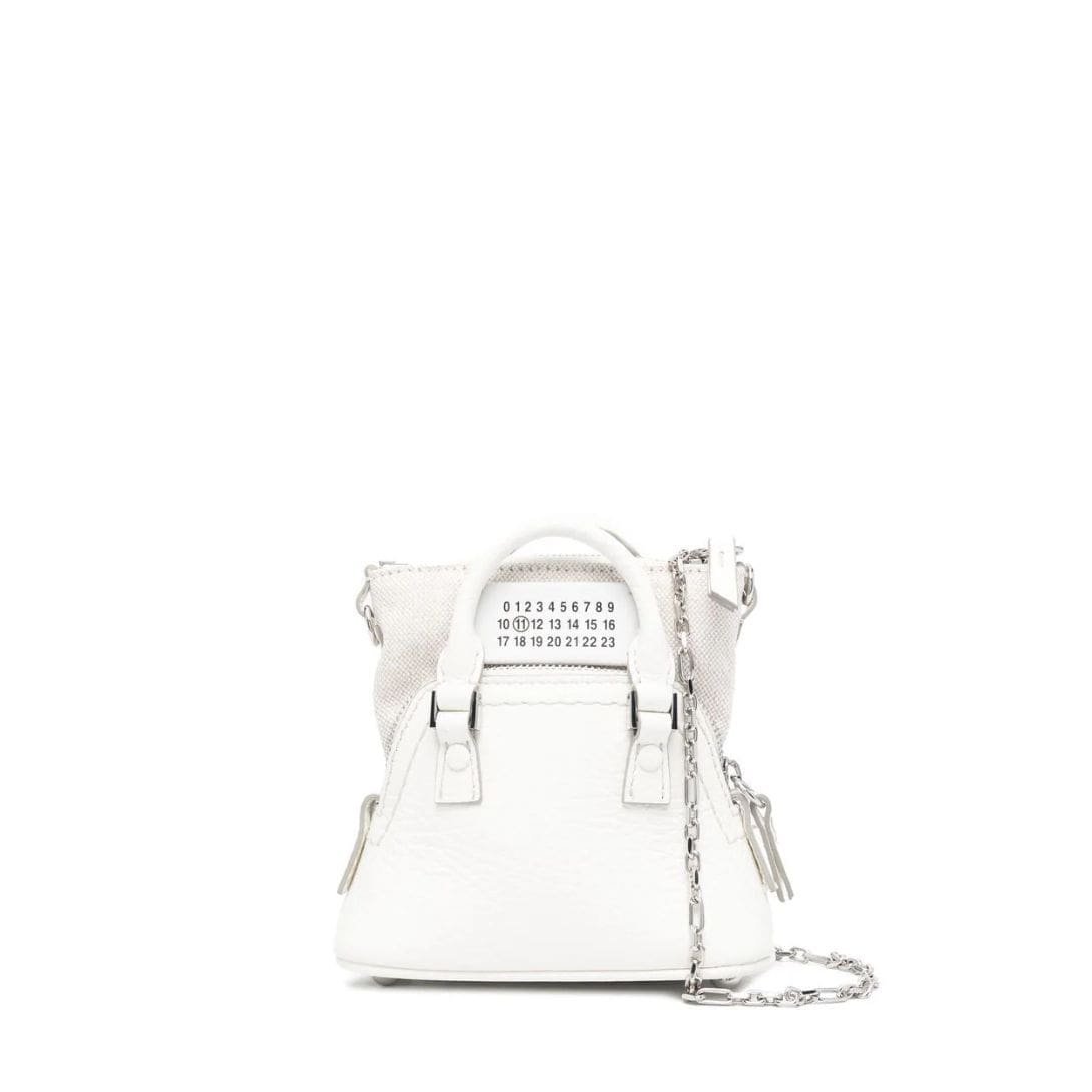 Maison Margiela 5AC Classique baby Top-handle bag Crafted in Italy, this exquisite accessory showcases a pristine white hue crafted from premium calf leather. Its design features intricate layers, adding depth and dimension to its aesthetic appeal. A distinctive number patch adorns the front, accentuating its contemporary charm. Secured by a top zip closure, it ensures easy access to essentials while maintaining a sleek silhouette. For added versatility, the bag comes with a detachable chain-link shoulder strap, allowing it to be carried in multiple ways. Meticulously crafted with a blend of calf leather and fabric, this piece epitomizes both sophistication and durability.