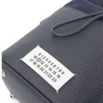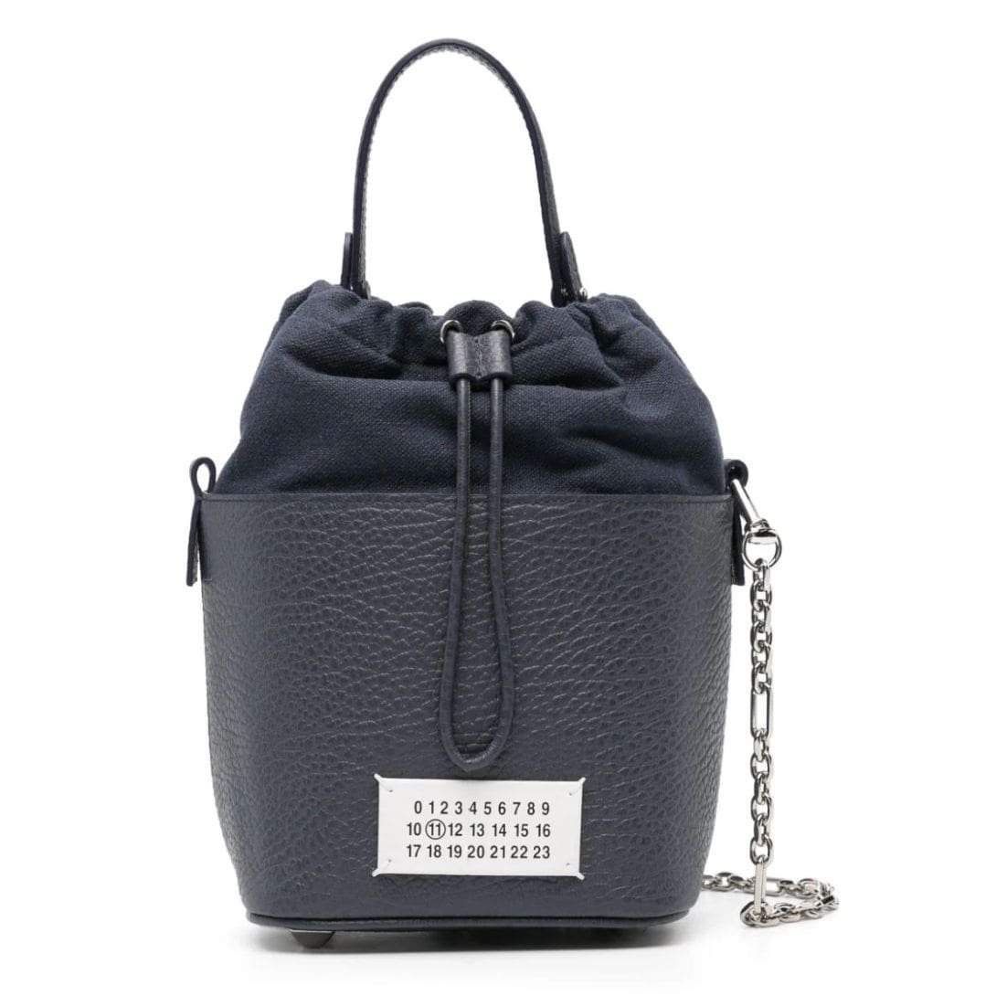 Maison Margiela 5AC logo-patch bucket bag Crafted with precision in Italy, this standout piece showcases a deep navy blue hue and is crafted from exquisite calf leather, featuring a distinct pebbled texture for added allure. The logo patch on the front, adorned with the signature numbers motif, adds a touch of sophistication.