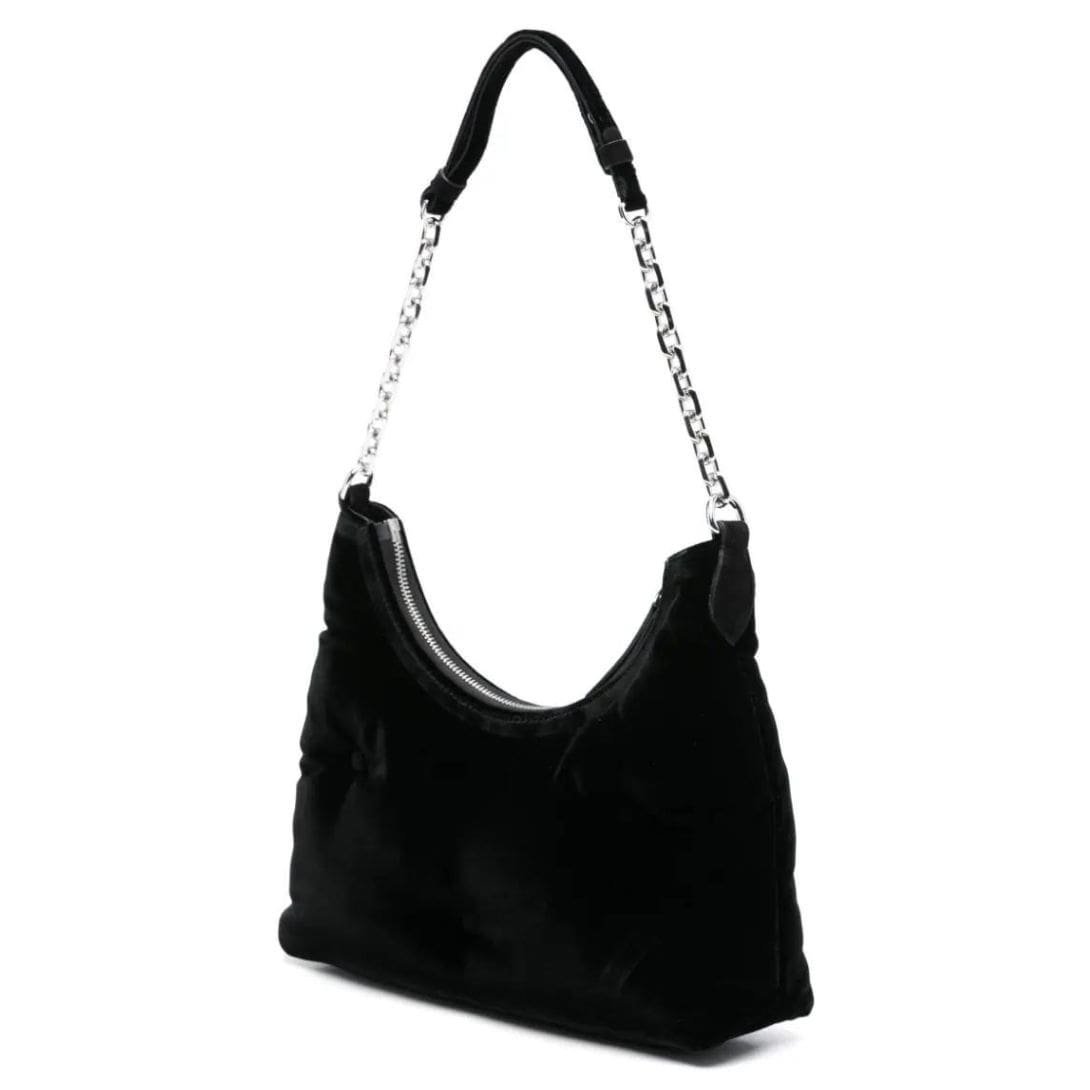 Equipped with a fabric and chain-link shoulder strap, this bag offers both style and versatility in carrying options. The spacious main compartment is complemented by an internal zip-fastening pocket and logo patch, providing ample space and organization for your belongings.