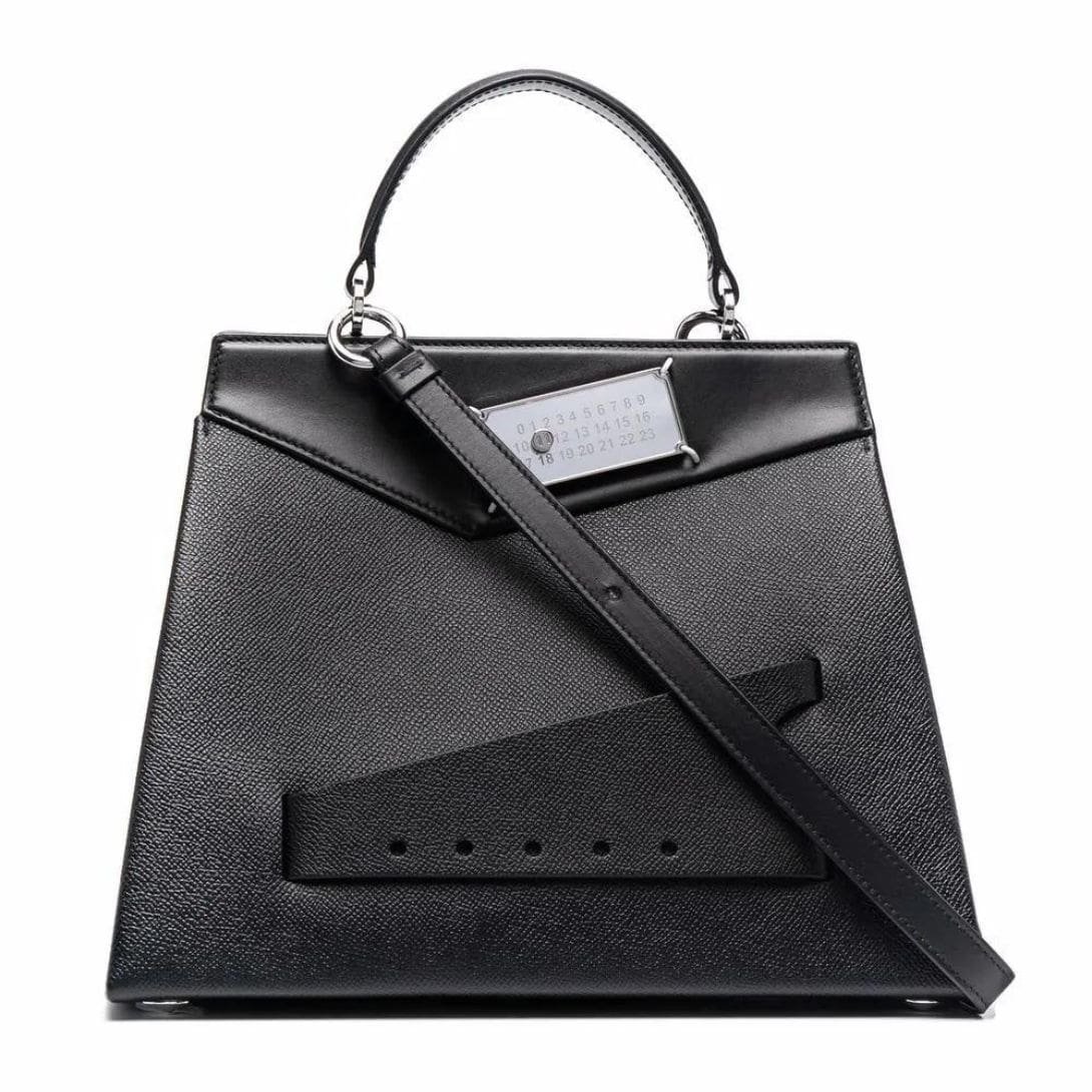 Presenting Maison Margiela Snatched leather tote bag, meticulously crafted in Italy to embody sophistication and versatility. This sleek accessory is rendered in classic black leather, exuding timeless elegance suitable for any occasion.