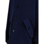 The coat features a classic caban design, characterized by its double-breasted front, large notch lapels, and a structured yet relaxed fit. The wool felt material offers a soft, velvety texture that feels indulgent against the skin while providing excellent insulation against the elements. The blue color is both versatile and eye-catching, allowing the coat to seamlessly transition from day to night and from casual to formal settings.