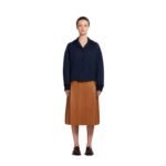 The knit trims are meticulously crafted, with a subtle contrast to the smooth wool and cashmere fabric. These trims are strategically placed along the collar, cuffs, and hem, offering a refined finish that enhances the overall aesthetic of the jacket. The attention to detail in the knitwork is evident, with the craftsmanship showcasing Marni’s commitment to quality and innovation.