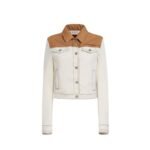 The jacket features a classic trucker silhouette, with a button-front closure, two chest pockets, and side pockets for added functionality. Its structure is enhanced by a tailored fit, which complements its rugged denim fabric without compromising comfort. The highlight of the design is the contrast yoke—a bold, contrasting fabric panel that runs across the shoulders and back. This unique detail adds a modern twist to the traditional trucker jacket, offering a striking visual contrast against the ecru denim.
