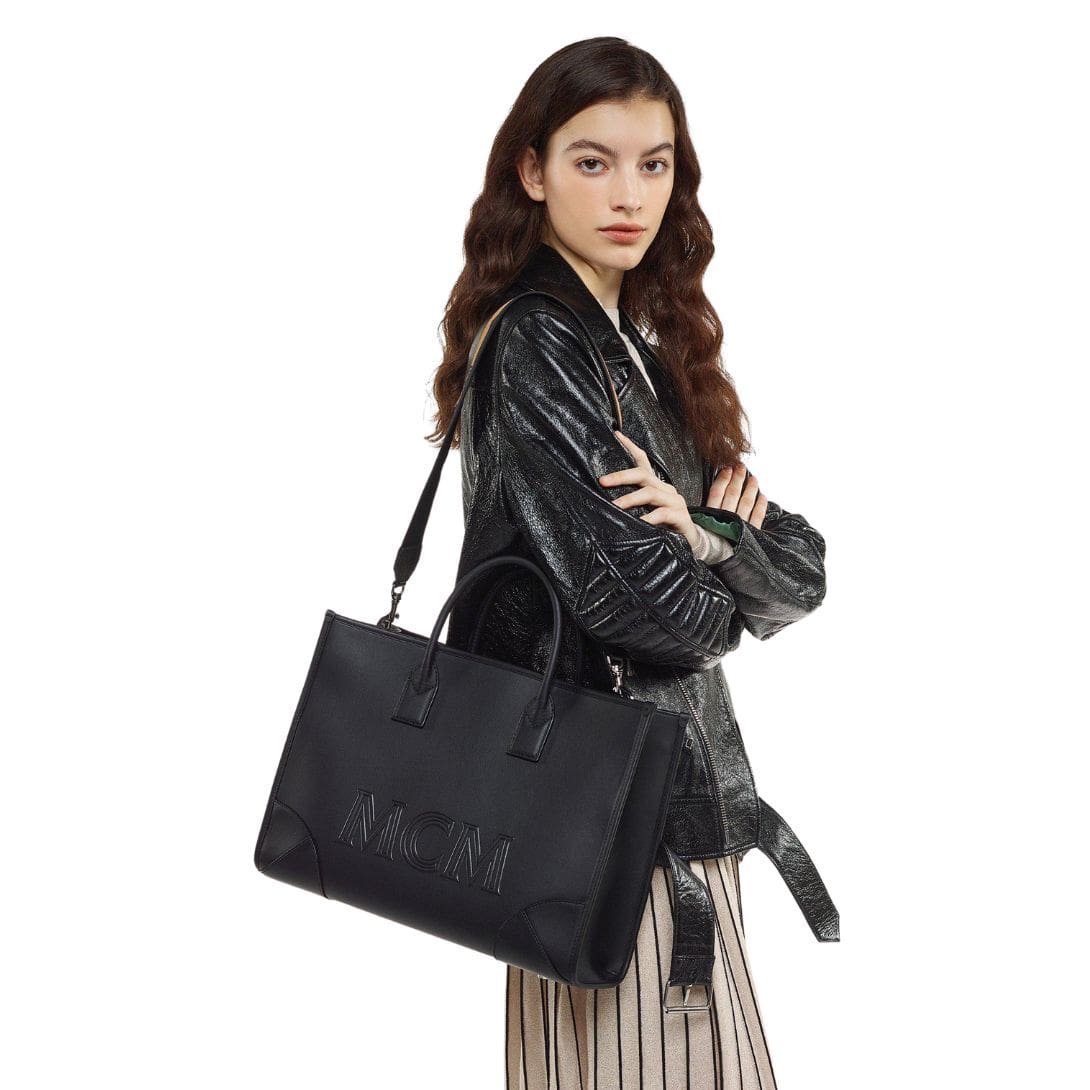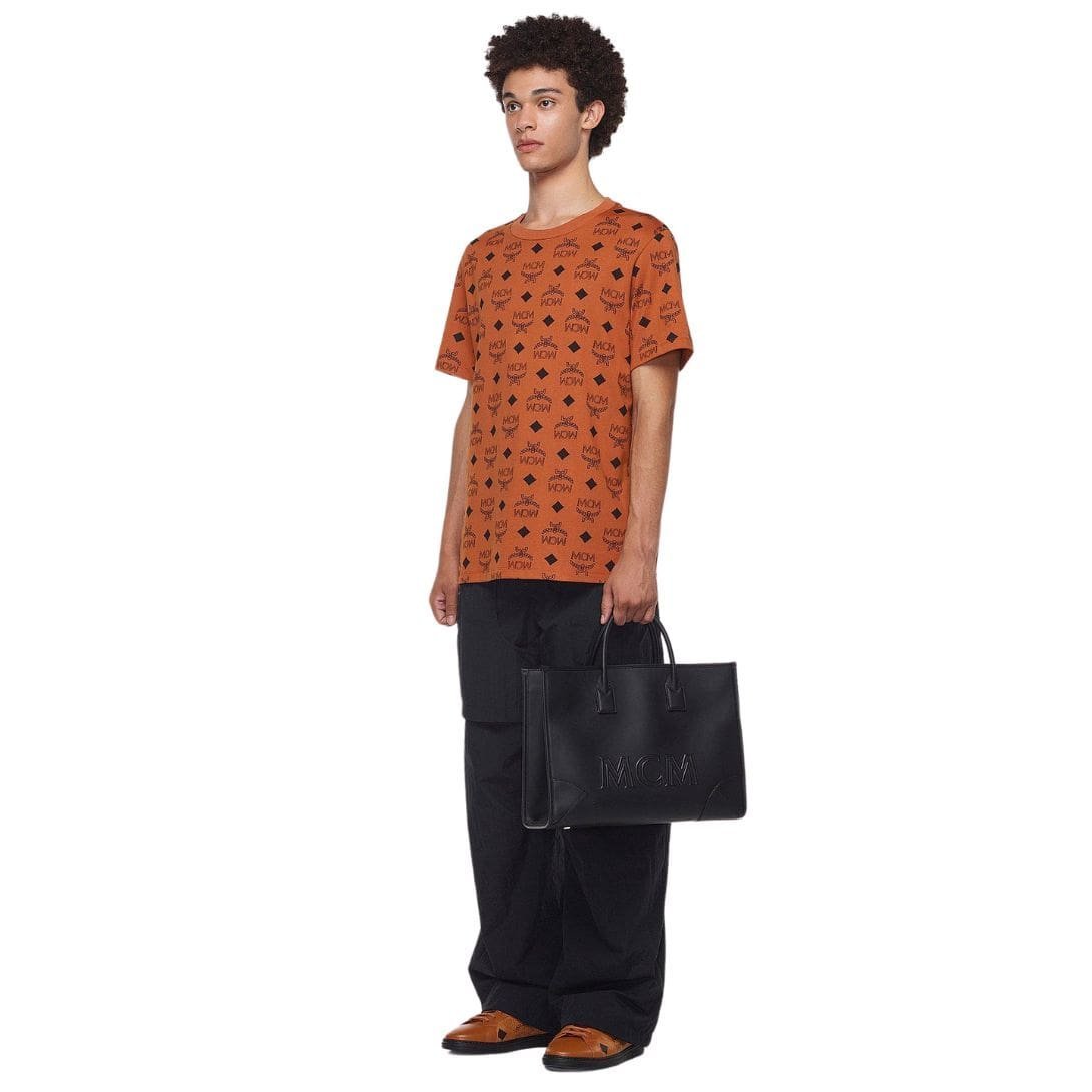 The München tote by MCM Large Munchen Tote In Spanish Calf Leather Black pays homage to the historic significance of Munich, the birthplace of the renowned fashion house. Crafted as a grand ode to this cultural hub, this tote encapsulates the spirit of the Bavarian capital in its design and functionality. Drawing inspiration from archival luggage, the tote features Nappa leather corners and an embossed logo, reminiscent of the jet-setting heritage associated with MCM.