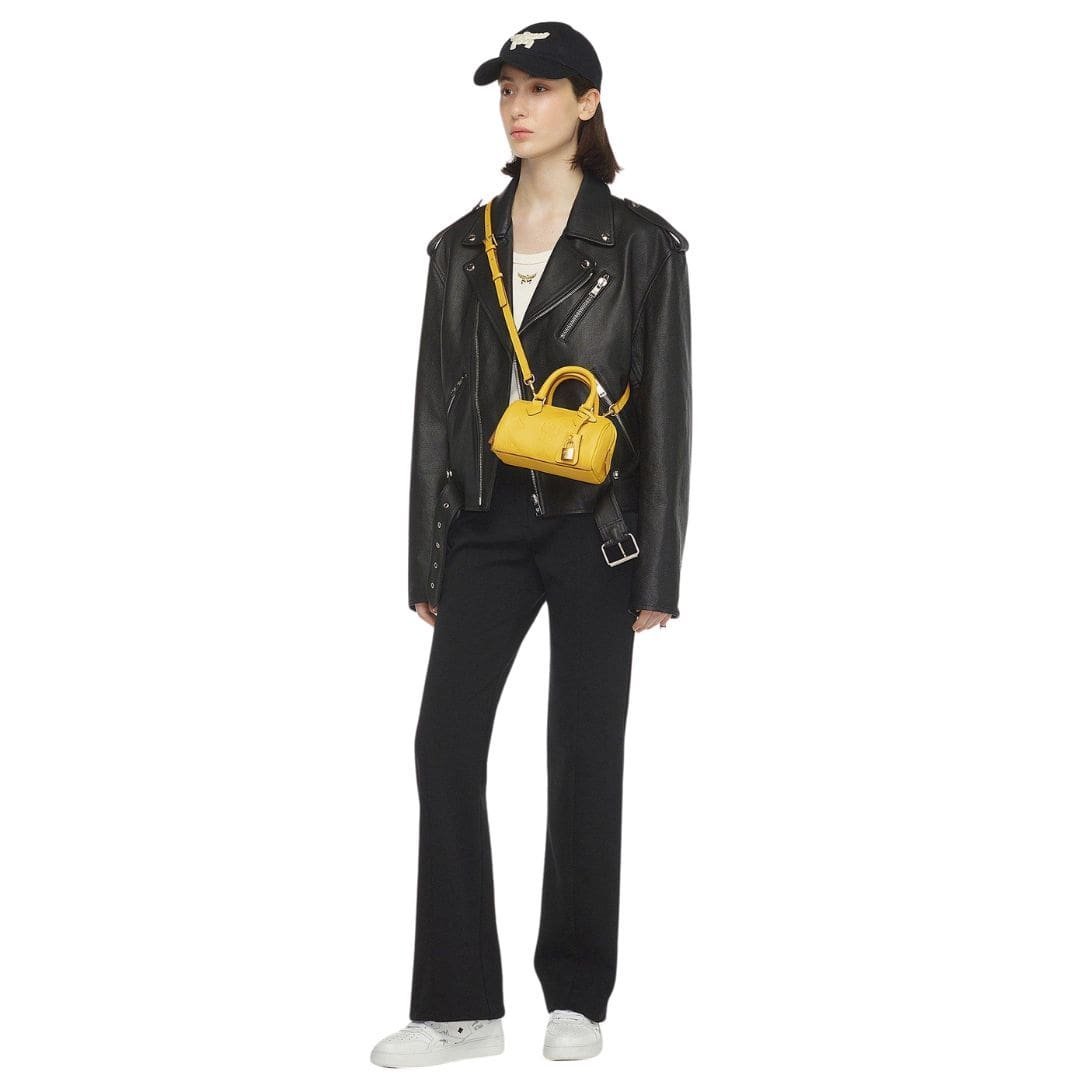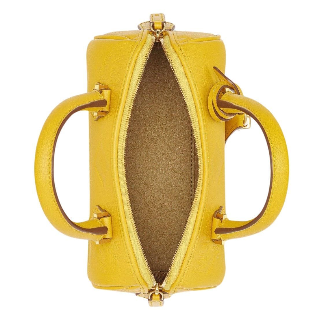 Indulge in the timeless allure of MCM small Ella Boston bag in maxi monogram leather yellow|old gold, a refined masterpiece meticulously crafted from natural Nappa leather, adorned with the iconic Maxi monogram. Evoking the opulence of Munich’s Golden Age, this compact yet capacious carryall is a testament to both style and functionality.
