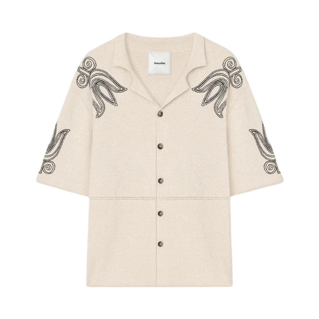 The standout feature of the Kaemon shirt lies in its attention to detail, with contrasting black floral motifs adorning the shoulders and sleeves, injecting a touch of modernity and visual interest into the classic silhouette. This intricate embroidery adds depth and texture to the shirt, creating a striking focal point that effortlessly catches the eye and elevates the overall look.