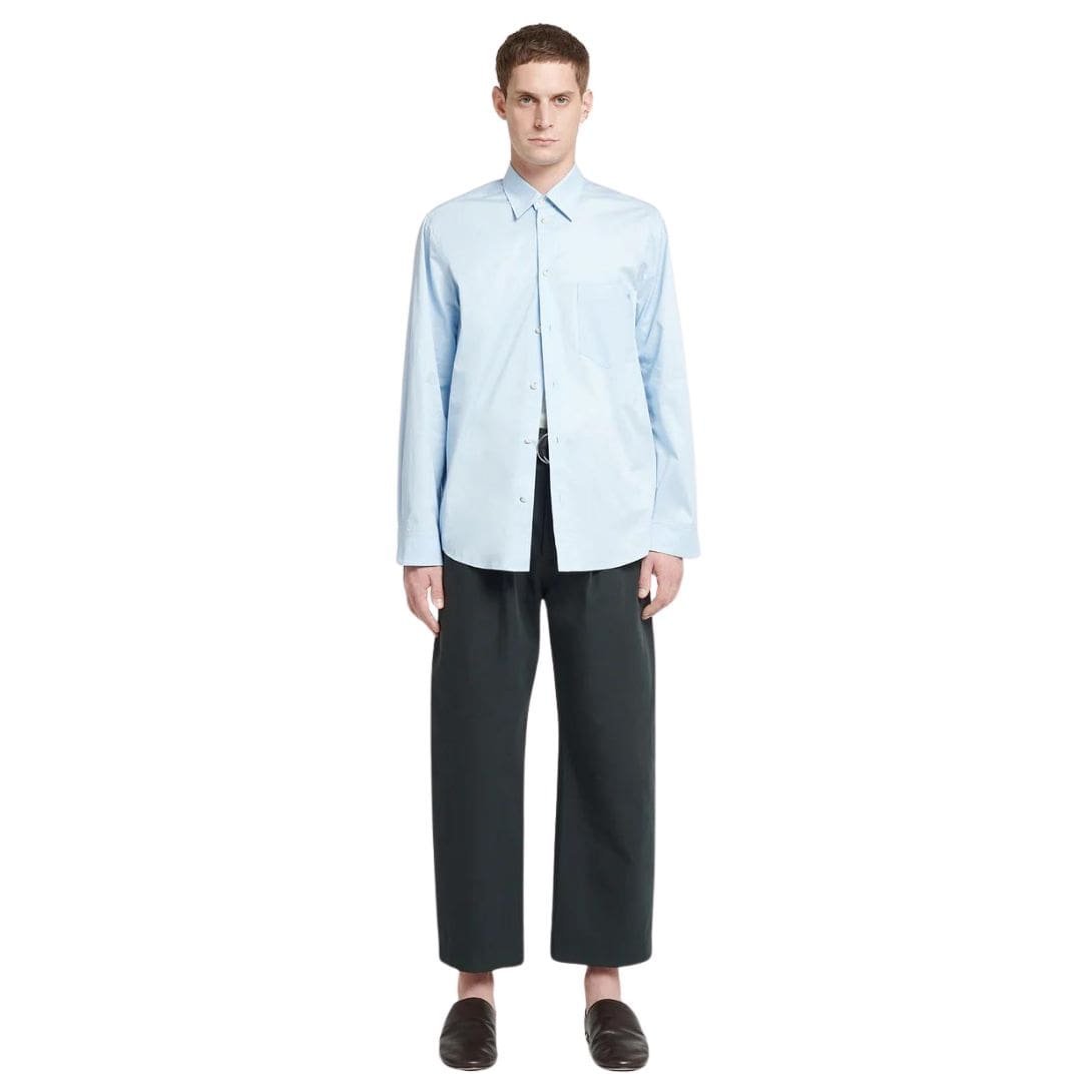 The sky-blue cotton fabric lends the Kaleb shirt a lightly structured yet airy feel, making it an ideal choice for various occasions and seasons. Its translucent finish adds a contemporary edge to the classic silhouette, creating a subtle contrast that elevates the shirt’s versatility and appeal.