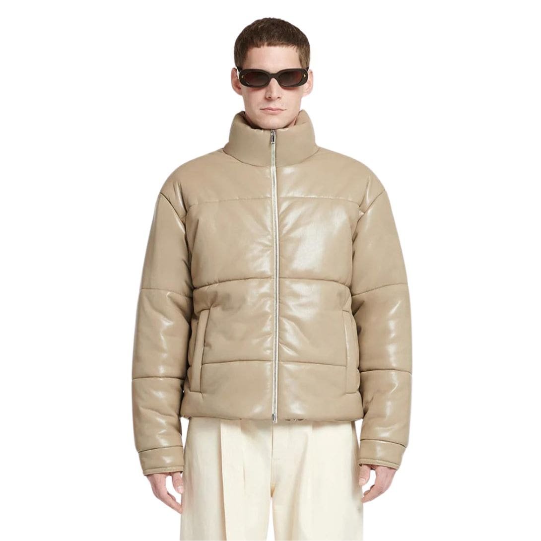 A Nanushka Marron Okobor Alt-Leather Puffer Jacket Ashy Taupe. puffer jacket is an indispensable item in any stylish wardrobe, combining functionality with fashion-forward design. The Marron jacket from Nanushka exemplifies this perfectly, offering a sophisticated take on the classic puffer. Crafted from Nanushka’s signature Okoborâ„¢ alt-leather in a refined ashy taupe hue, the Marron jacket is a testament to the brand’s commitment to sustainability and innovation in materials. This unique alternative leather not only mimics the luxurious feel and appearance of genuine leather but also aligns with environmentally conscious practices, making it an ethical choice without compromising on style.