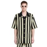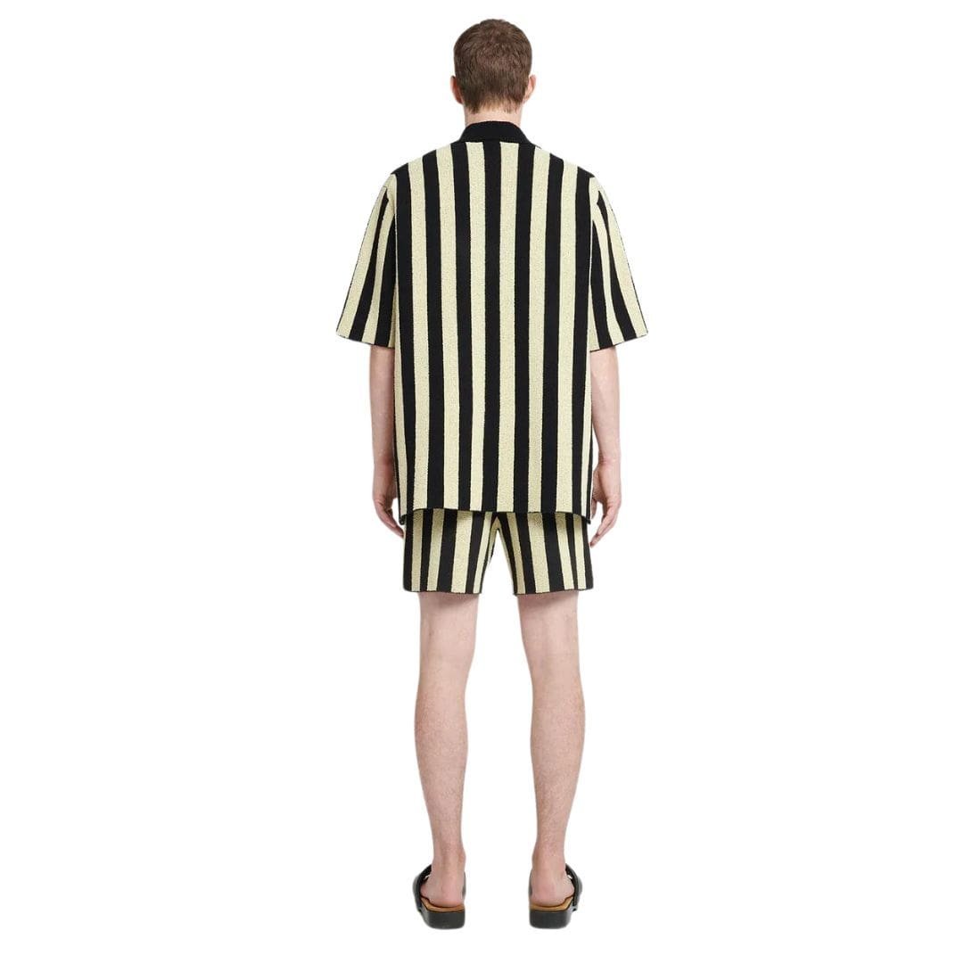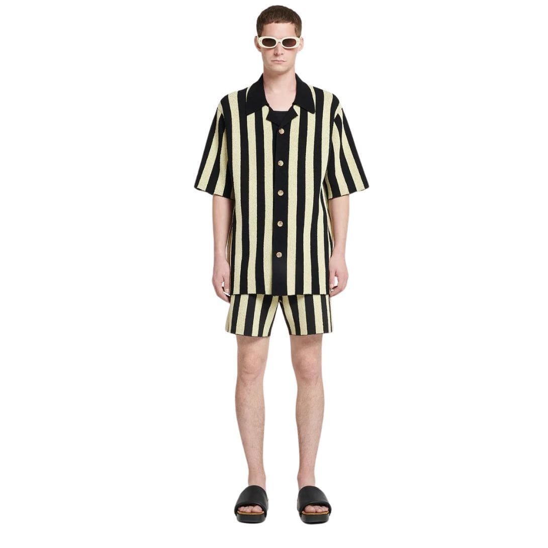 Infused with a sense of casual sophistication, the NANUSHKA ZIKO TERRY-KNIT SHIRT BLACK/PALE offers a contemporary twist on classic menswear. Crafted with meticulous attention to detail, this shirt boasts a neat straight fit that is both flattering and comfortable. The silhouette is accentuated by pale yellow and black stripes, adding a touch of visual interest and modernity to the piece.