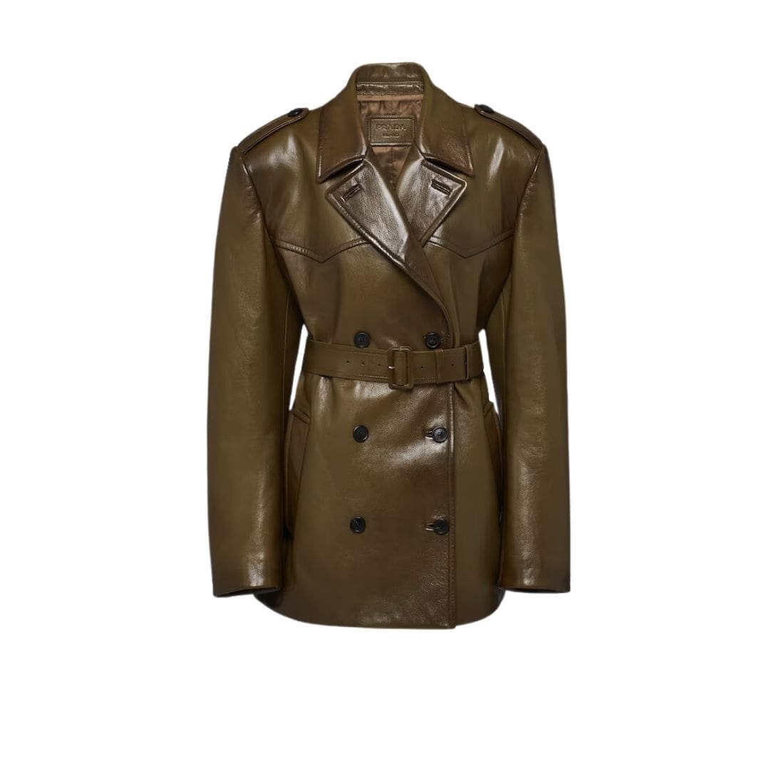 At first glance, the coat’s silhouette commands attention with its structured double-breasted design, exuding an aura of refined masculinity or bold femininity depending on the wearer’s styling. The rich, supple leather exterior boasts a luxurious sheen, showcasing Prada’s commitment to using only the finest materials.