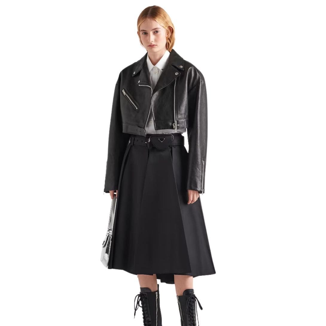 The versatility of the Prada Leather Biker Jacket knows no bounds. Whether paired with distressed denim for a casual daytime look or layered over a tailored dress for a night out, it effortlessly transitions from day to night, adapting to any occasion with effortless sophistication.