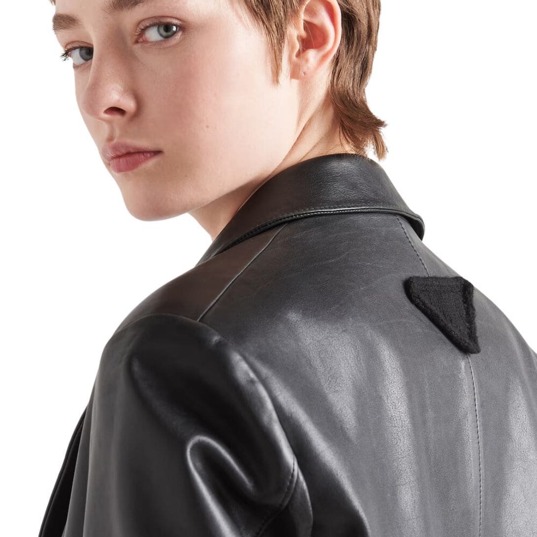 Prada’s attention to detail is evident in every aspect of the jacket’s construction. From the precision stitching to the carefully placed hardware, every element is meticulously executed to perfection. The iconic Prada logo discreetly adorns the jacket, serving as a symbol of unparalleled quality and prestige.PRADA LEATHER JACKET