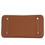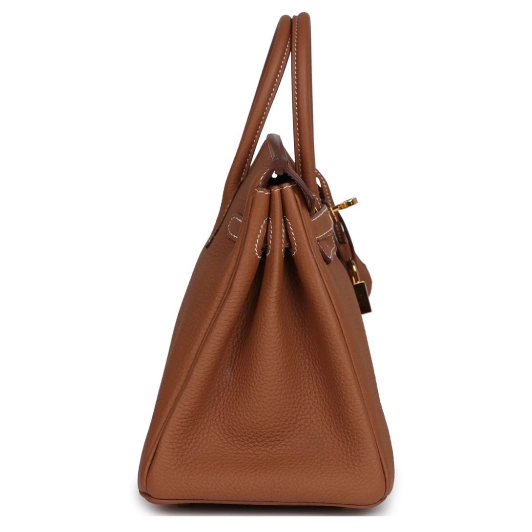 This Birkin is crafted in Gold Togo leather with gold hardware, known for its luxurious texture and durability. It features contrast stitching, a front flap with two straps and a center toggle closure, a clochette with lock and two keys, and double rolled handles for a refined, iconic look.