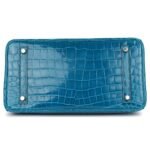 This Pre-Owned Hermès Birkin 30 Bleu Izmir Shiny Niloticus Crocodile Palladium Hardware is crafted from Bleu Izmir shiny Niloticus crocodile leather with palladium hardware. It features tonal stitching, a front flap, two straps with a center toggle closure, a clochette with a lock and two keys, and double rolled handles.