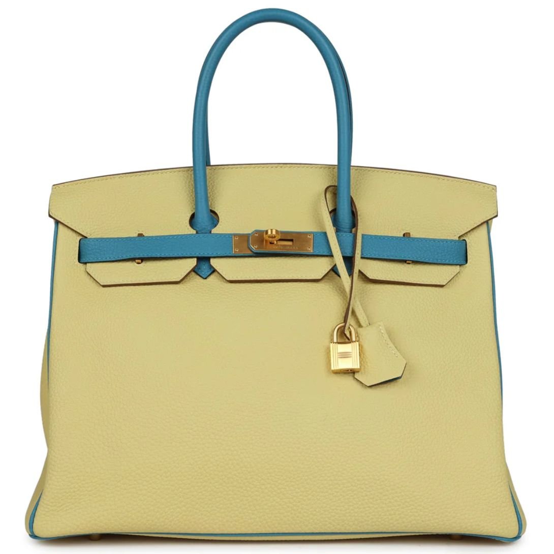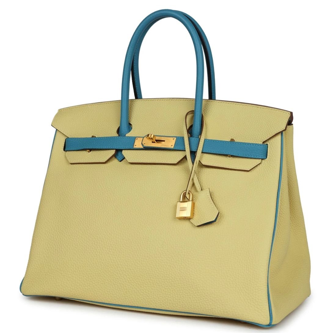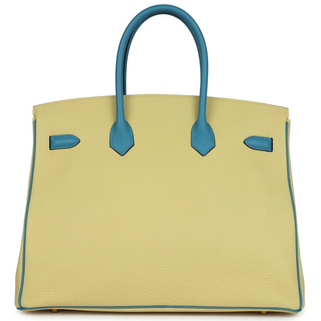 PRE-OWNED HERMÈS SPECIAL ORDER (HSS) BIRKIN 35 JAUNE POUSSIN AND BLEU PARADISE TOGO BRUSHED GOLD HARDWARE